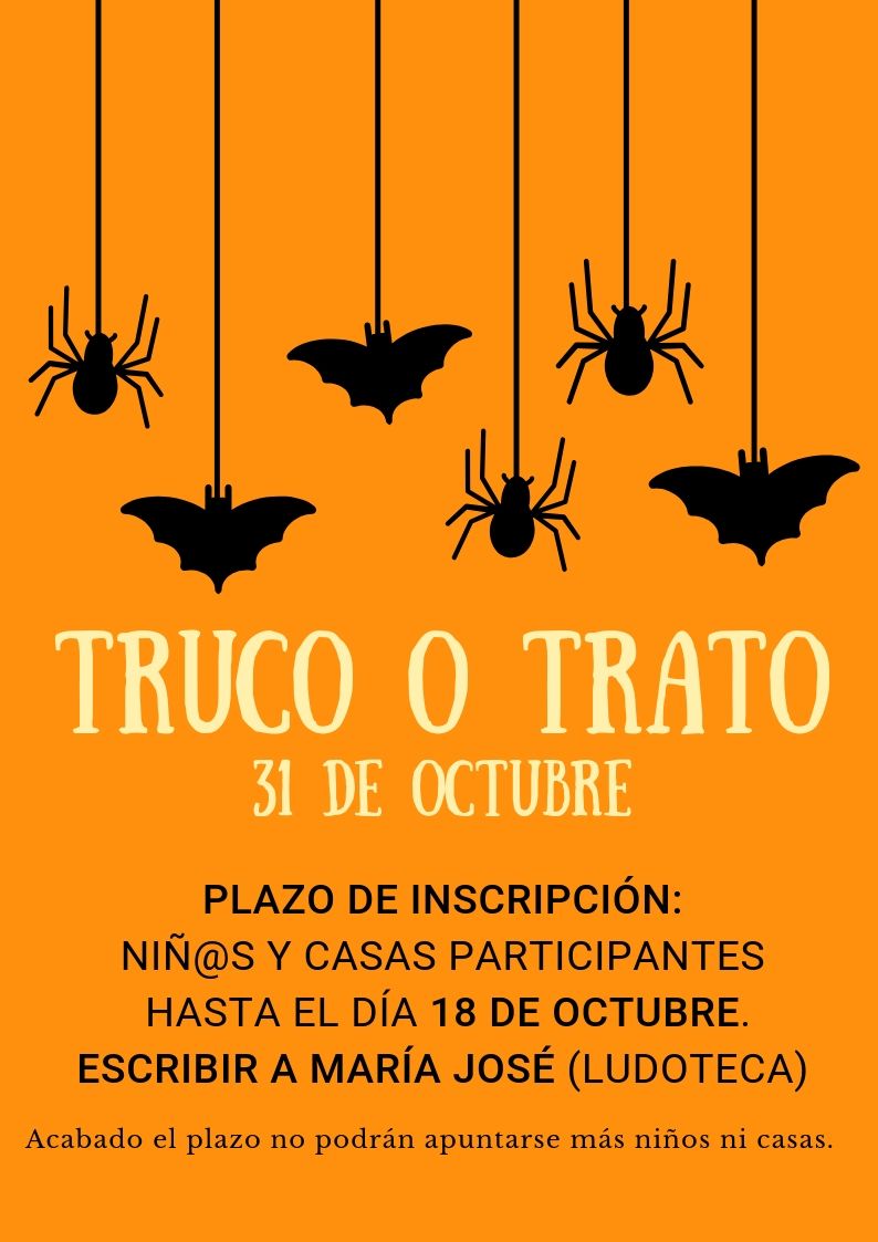 Truco o trato halloween2019-10-11 15:14:23Info GeneralEl día 31 de octubre celebramos Halloween y tendrá lugar la actividad de Truco o trato. El plazo de inscripción de los niñ@s y casas que quieran participar será desde hoy hasta el día 18 de octubre. Para realizar la inscripción escribe un mensaje a María Jose (Ludoteca). Una vez terminado el plazo no podrán apuntarse más niñ@s ni casas.