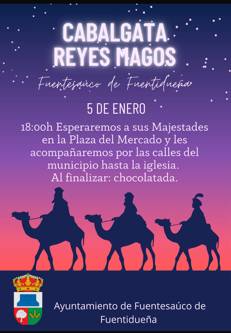 Nos reuniremos en la plaza del Mercado para esperar la llegada de Sus Majestades. A continuación, les acompañaremos en la cabalgata por el pueblo hasta la iglesia, donde entregarán los regalos. Tras la cabalgata se ofrecerá chocolate para todas las personas que asistan al evento .