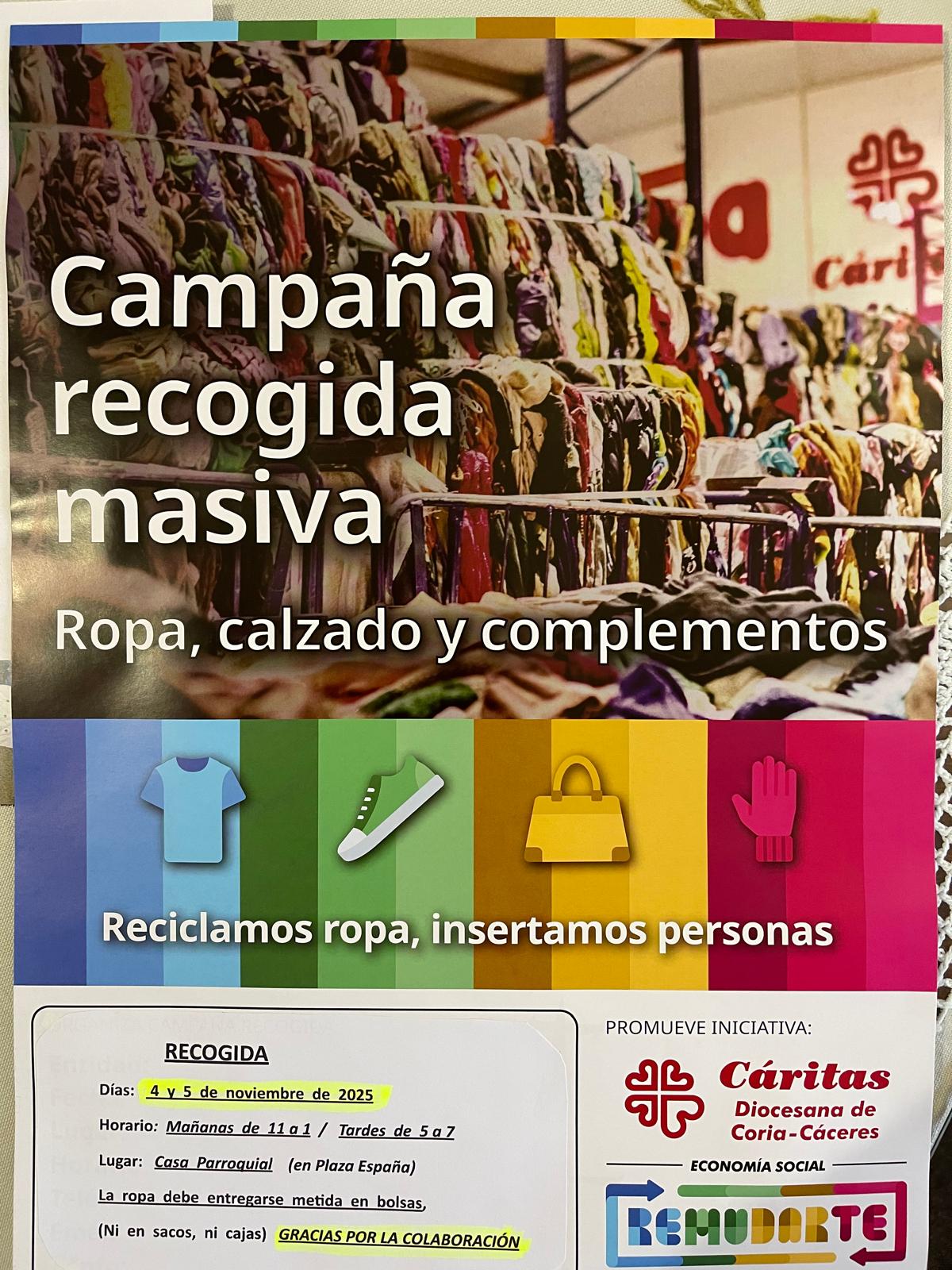 SE INFORMA QUE DOS DÍAS DE LA SEMANA DEL 3 AL 7 DE NOVIEMBRE, HABRÁ NUEVA RECOGIDA DE ROPA, CALZADO Y BOLSOS.