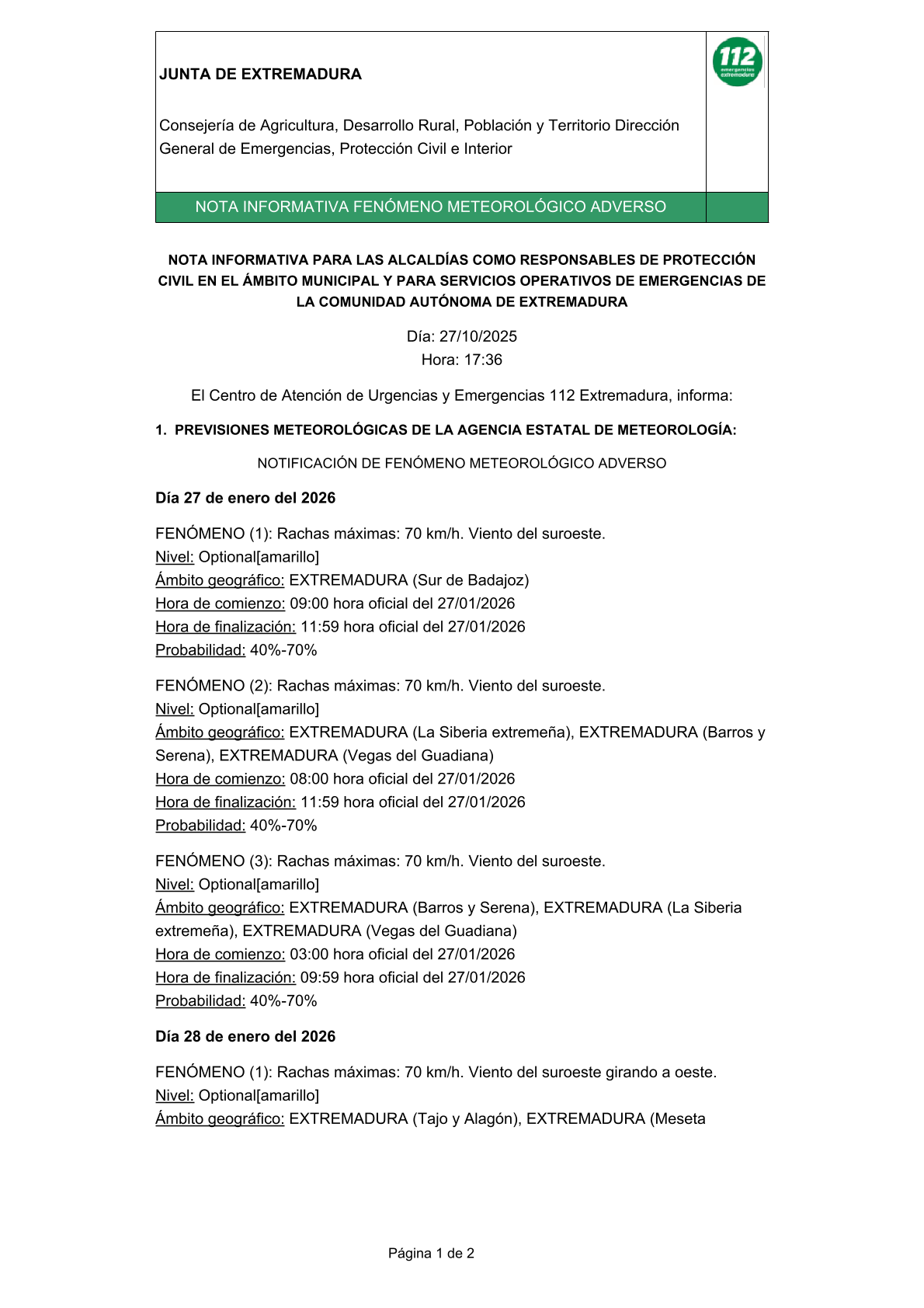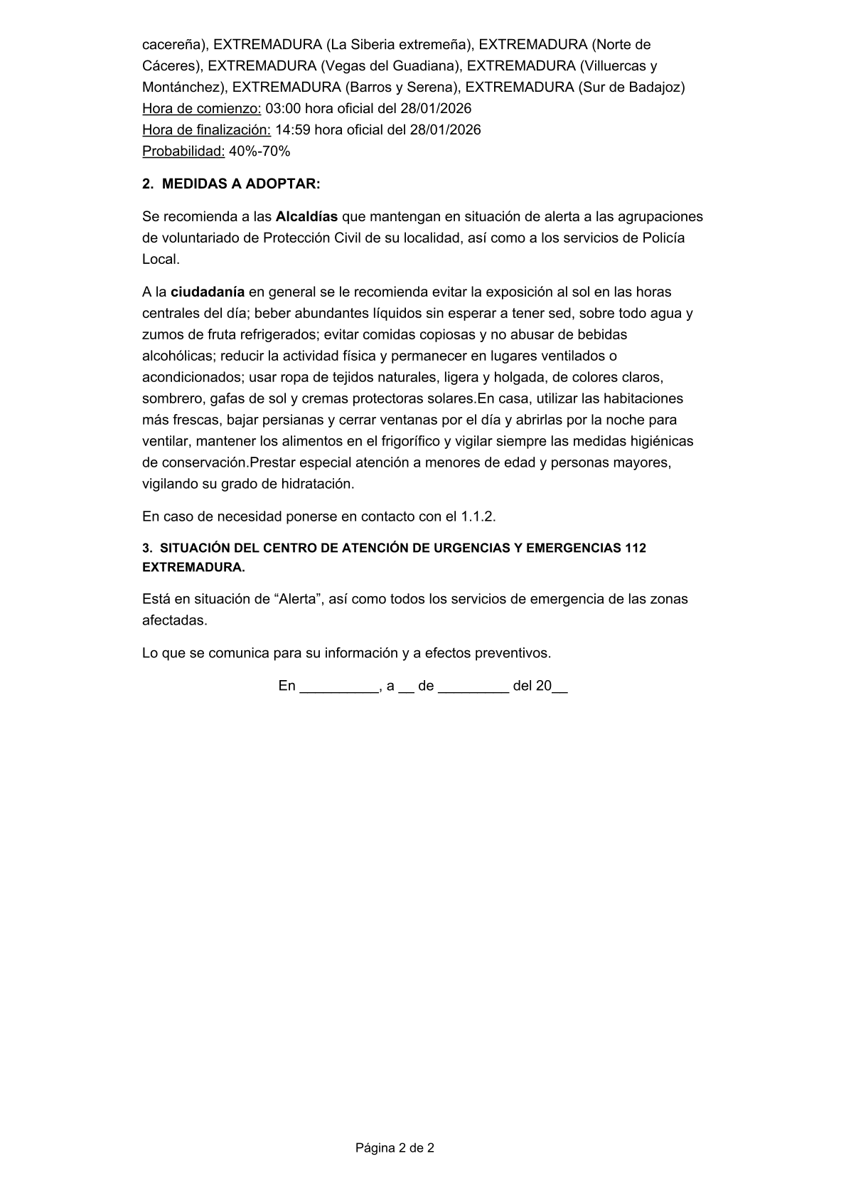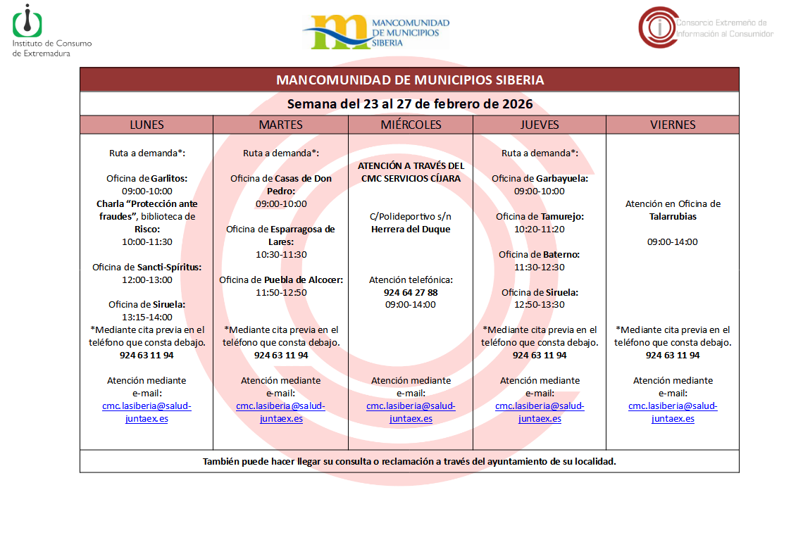 COMUNICADO DE LA DIRECCIÓN DEL CENTRO DE SALUD: POR MOTIVOS METEOROLÓGICOS OBVIOS SE SUSPENDEN LAS CONSULTAS EL DÍA DE HOY. SE ATENDERAN URGENCIAS EN EL TELÉFONO DE URGENCIAS DEL CENTRO DE SALUD (924626077), FUNCIONANDO COMO CUALQUIER DÍA FESTIVO. -