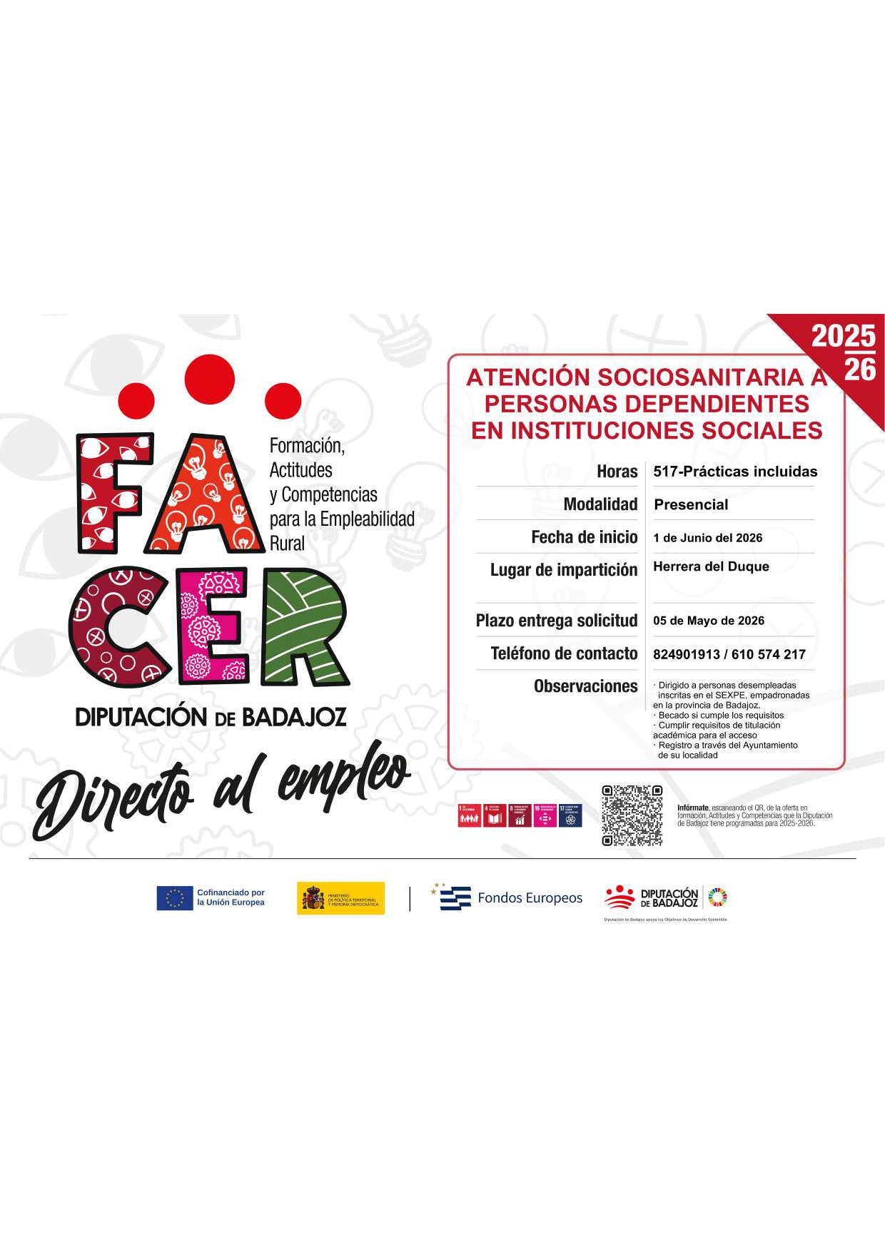 Desde el Proyecto FACER de la Diputación de Badajoz informan del curso conducente al Certificado Profesional “Atención Sociosanitaria a Personas Dependientes en Instituciones Sociales”, dirigido al territorio del Centro Integral de Desarrollo (CID) La Sibería y localidades cercanas.