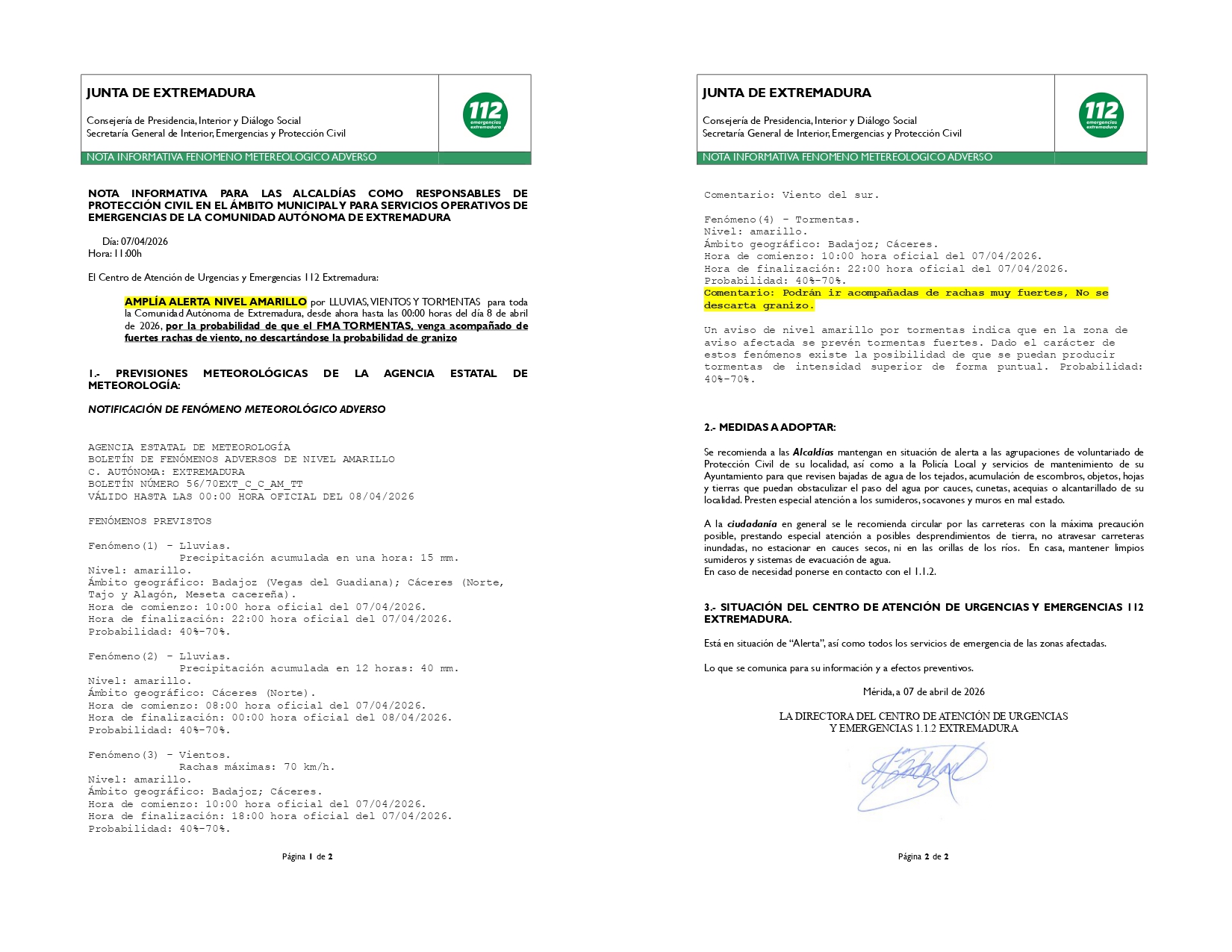ALERTA AMARILLA EN ALGUNAS ZONAS DE LA CC.AA DE EXTREMADURA