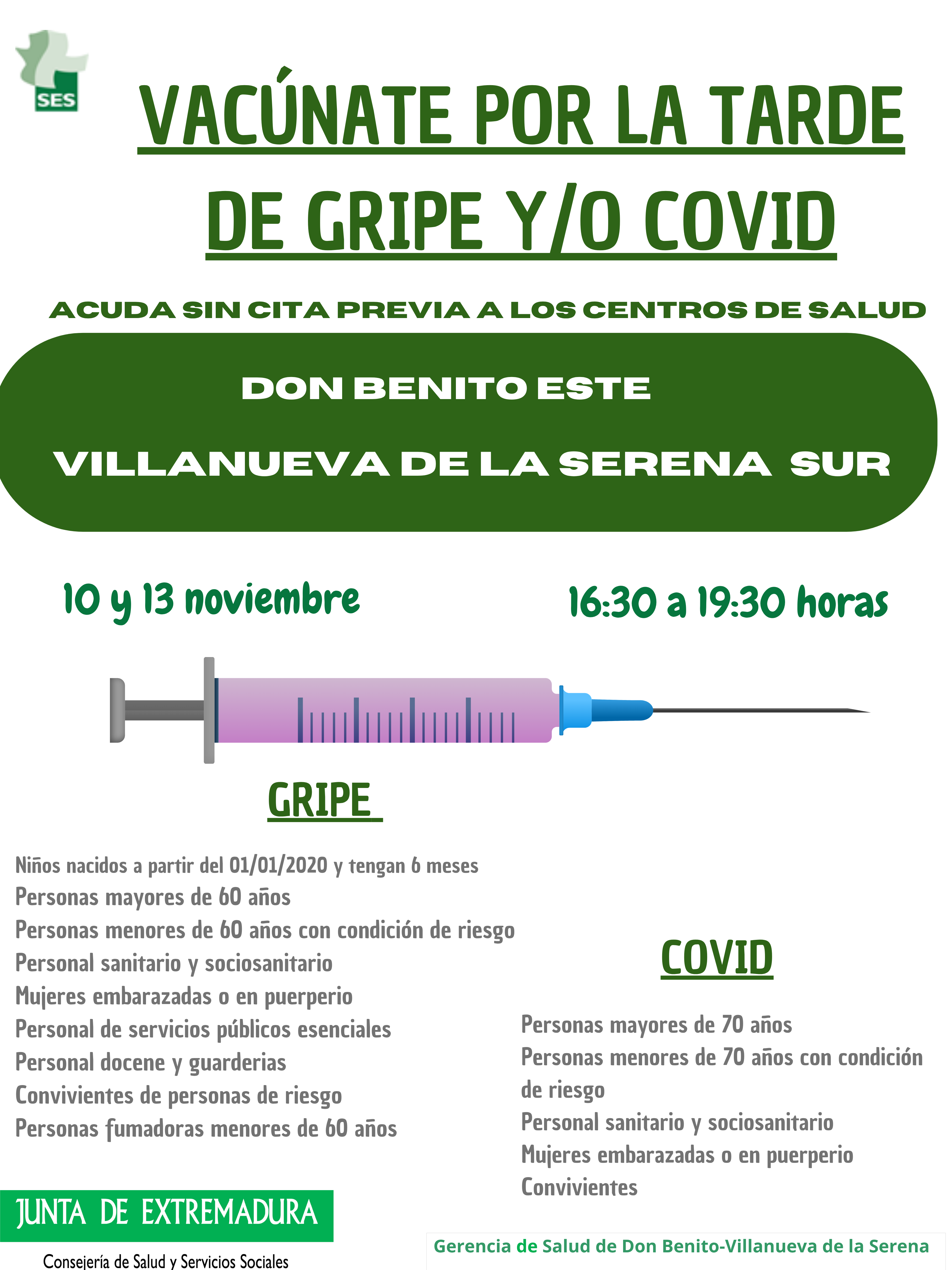 VACÚNATE POR LA TARDE DE GRIPE Y/O COVID EN LOS CENTROS DE SALUD DON BENITO ESTE ,VILLANUEVA LA SERENA SUR SIN CITA PREVIA