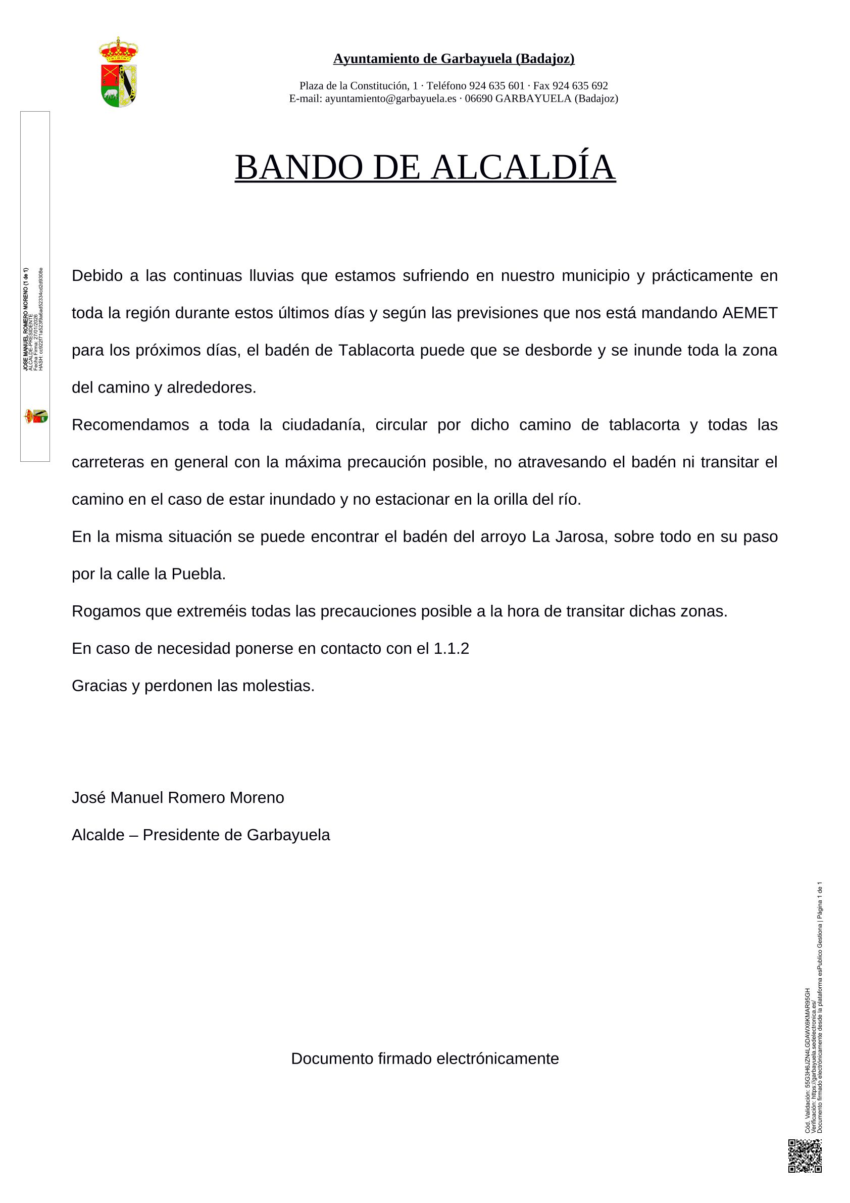 Se informa a la ciudadanía que el baden del Arroyo La Jarosa, por la calle la Puebla permanece cerrado al tránsito, tanto de salida como de entrada, hasta nuevo aviso debido a los daños ocasionados por las fuertes lluvias registradas en los últimos días.