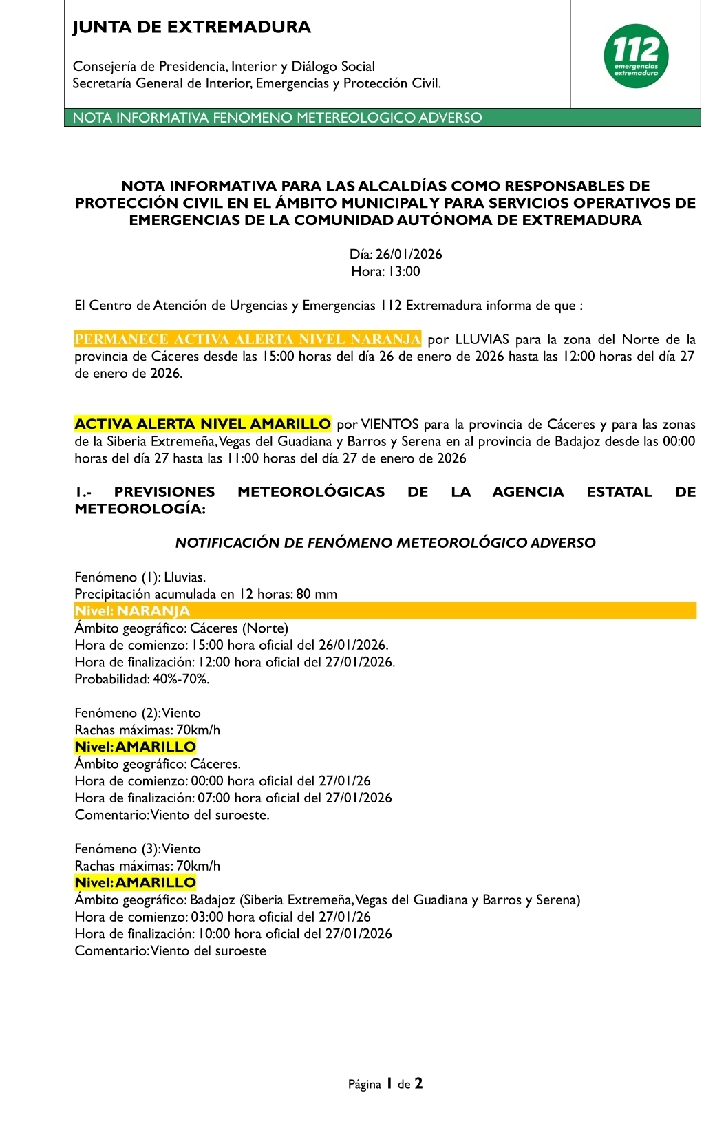 Fenómeno: Lluvias. Precipitación acumulada en 12 horas: 40 mm. Nivel: AMARILLO Ámbito geográfico: Cáceres Norte Hora de comienzo: 12:00 hora oficial del 27/01/2026 Hora de finalización: 18:00 hora oficial del 27/01/2026 Probabilidad: 40%-70% 2.- MEDIDAS A ADOPTAR: