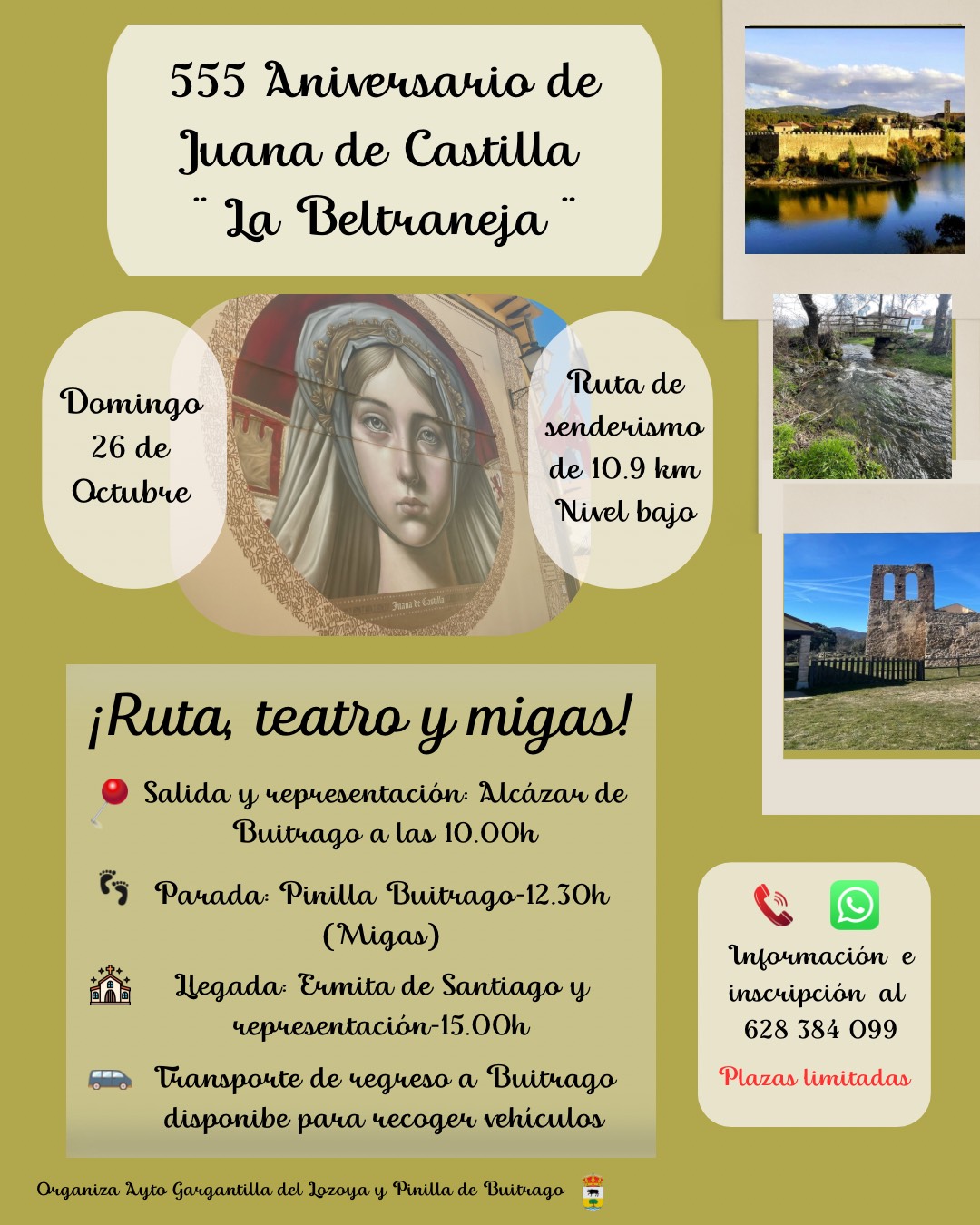 El domingo 26 de octubre, te invitamos a recorrer el camino de la princesa Juana de Castilla, la Beltraneja, desde Buitrago hasta la Ermita de Santiago, en una actividad que combina historia, teatro, naturaleza y gastronomía tradicional.