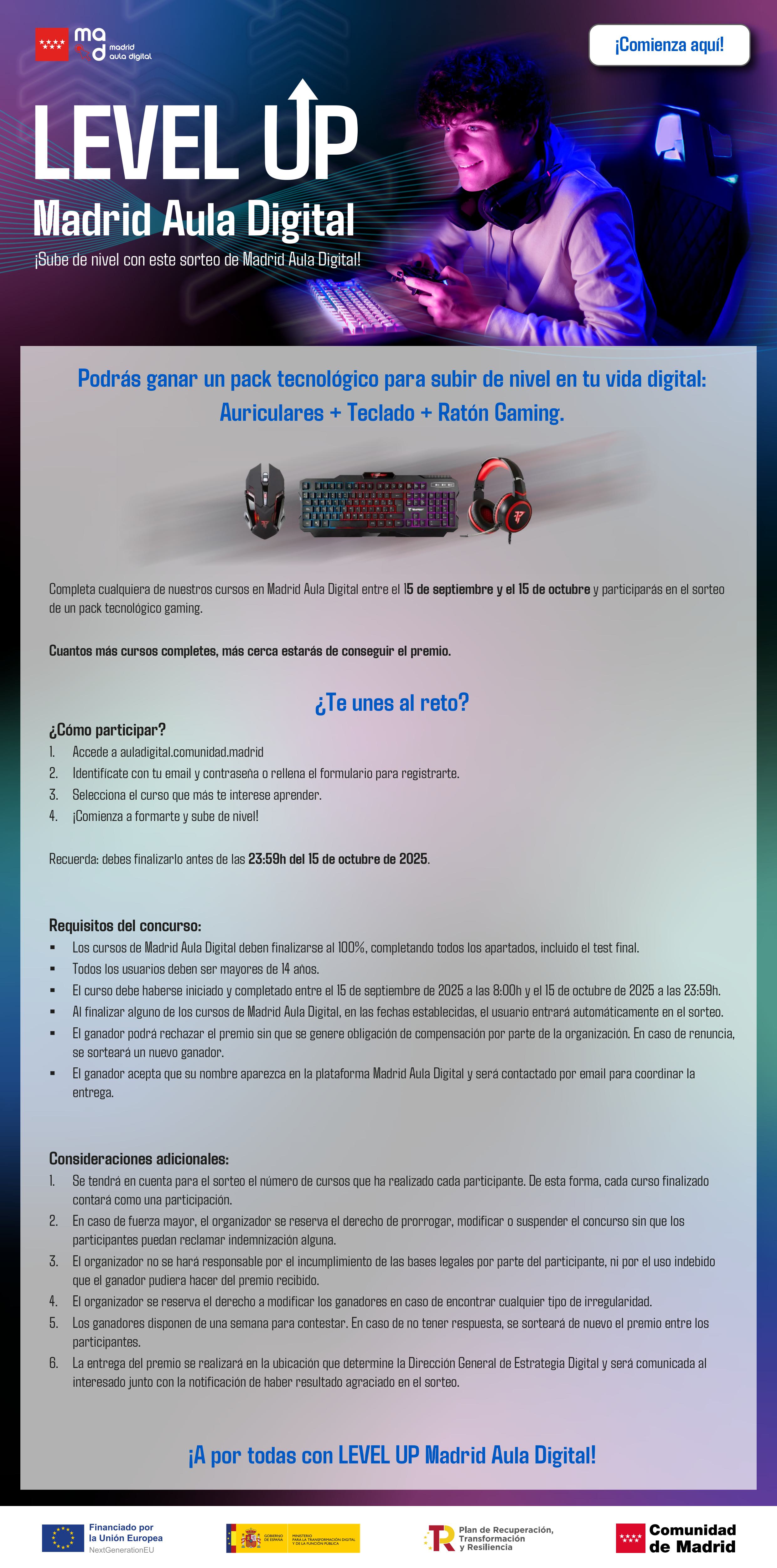 👉 Hasta el 15 de octubre, cualquier persona que complete uno de los cursos online gratuitos podrá entrar en el sorteo de un pack tecnológico gaming (Auriculares Teclado Ratón).