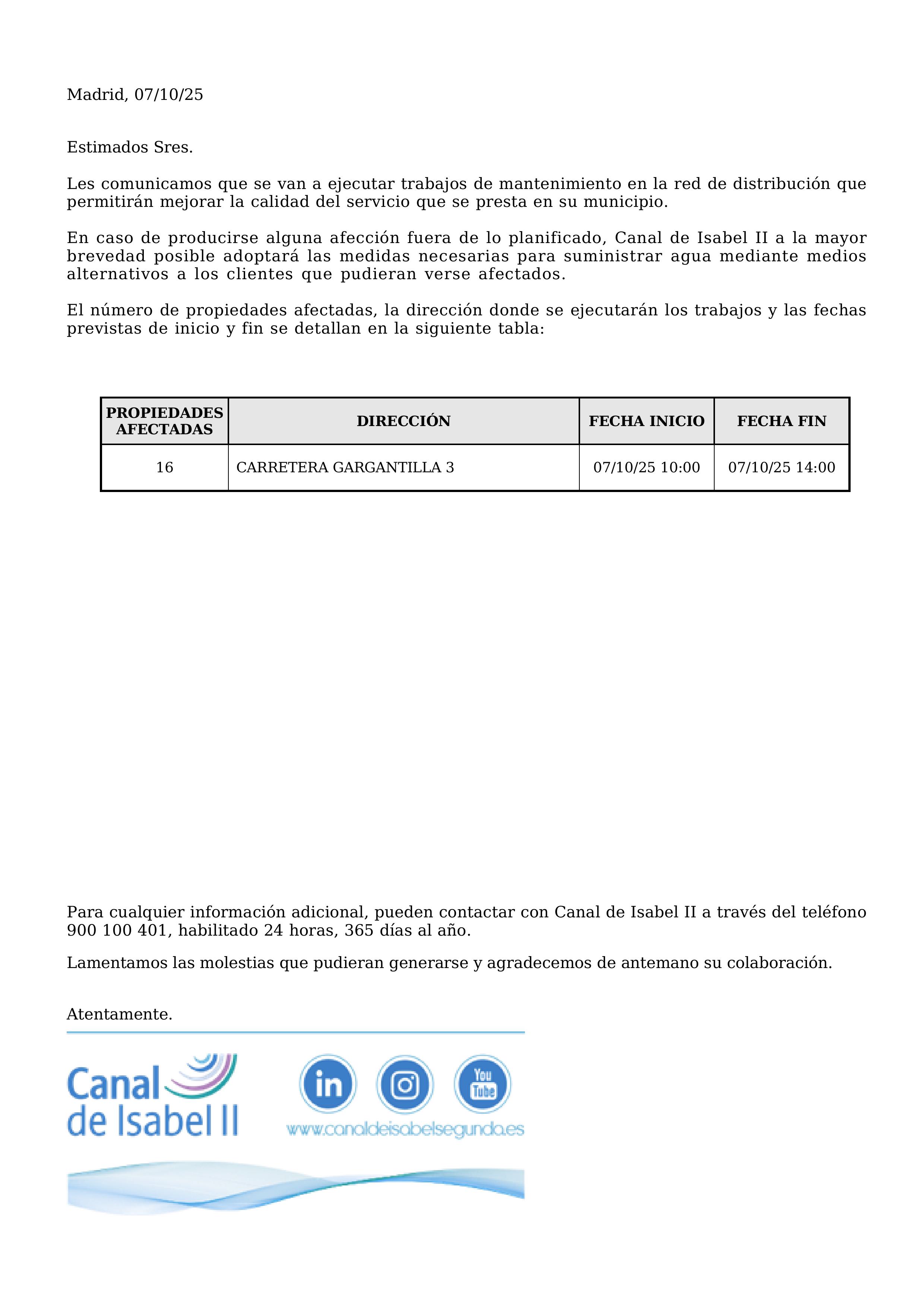 Corte de agua en Gargantilla del Lozoya día 2 de octubre de 2025