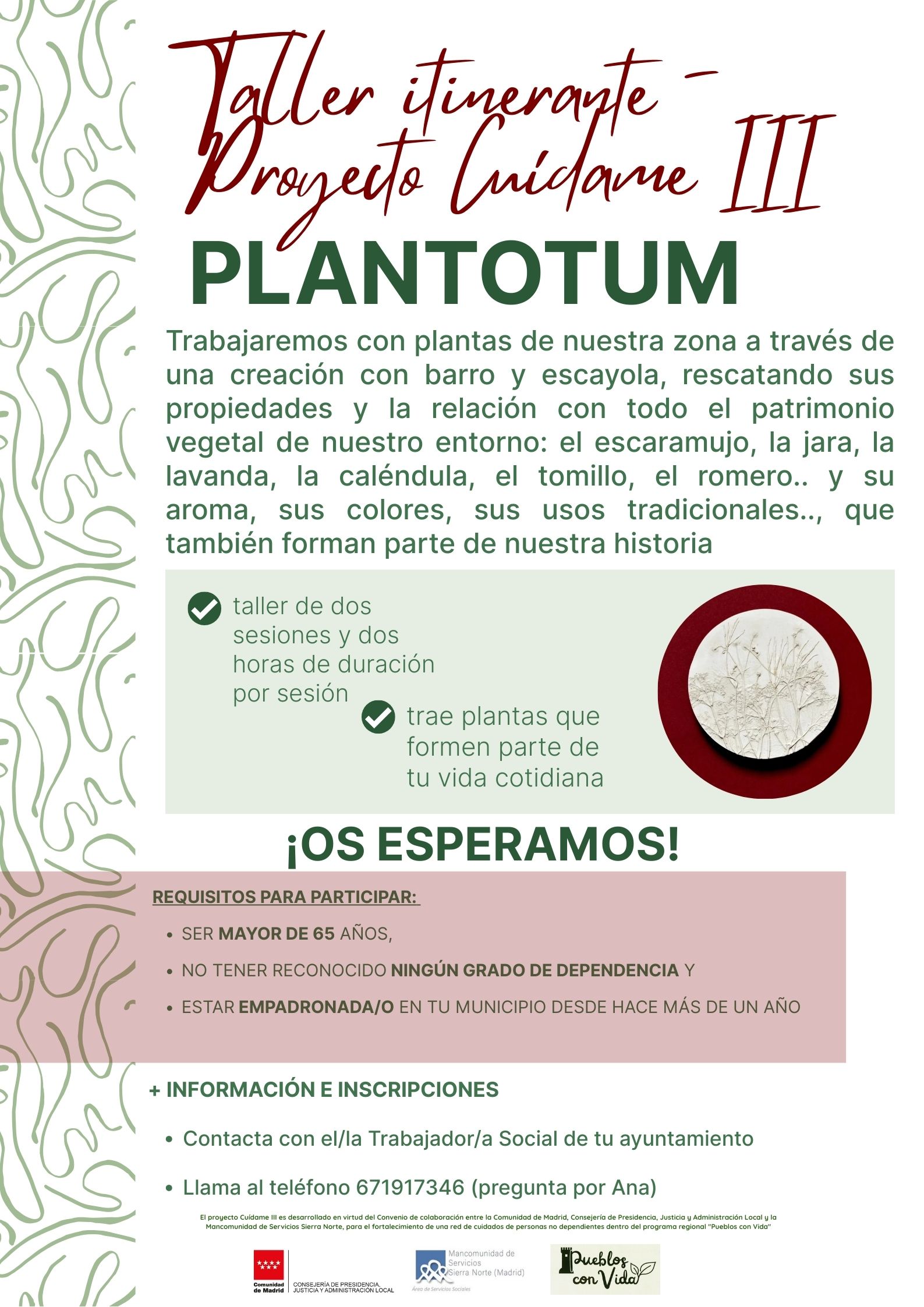 Desde la Mancomunidad de Servicios Sierra Norte y en relación a la dinamización del Proyecto Cuídame III ya en marcha, os hacemos llegar este cartel del Taller Plantotum, una propuesta itinerante con la intención de que pueda realizarse en todos los municipios que participan en el proyecto, para vuestro conocimiento y para solicitar vuestra colaboración en su difusión.