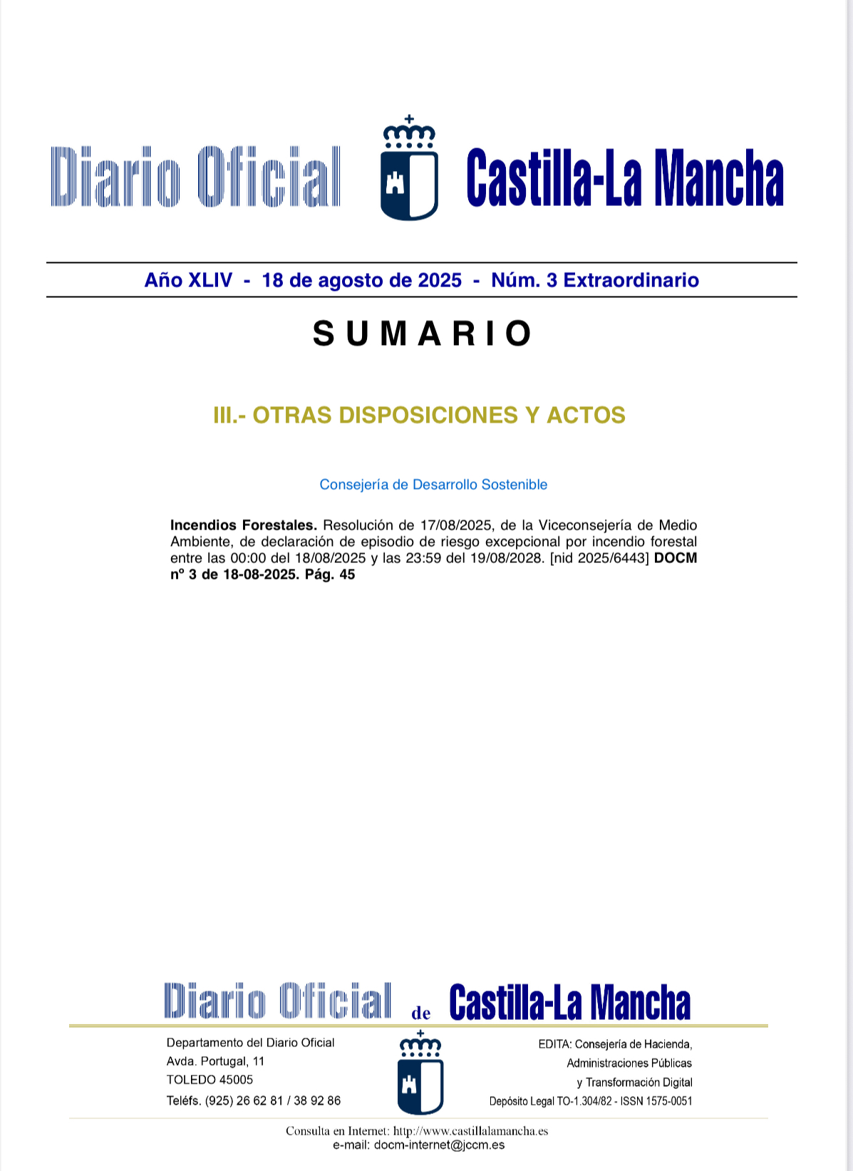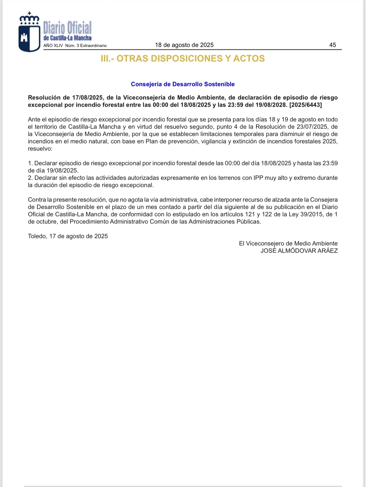 Ante el episodio de riesgo excepcional por incendio forestal que se presenta para los días 18 y 19 de agosto en todo el territorio de Castilla-La Mancha y en virtud del resuelvo segundo, punto 4 de la Resolución de 23/07/2025, de la Viceconsejería de Medio Ambiente, por la que se(...)