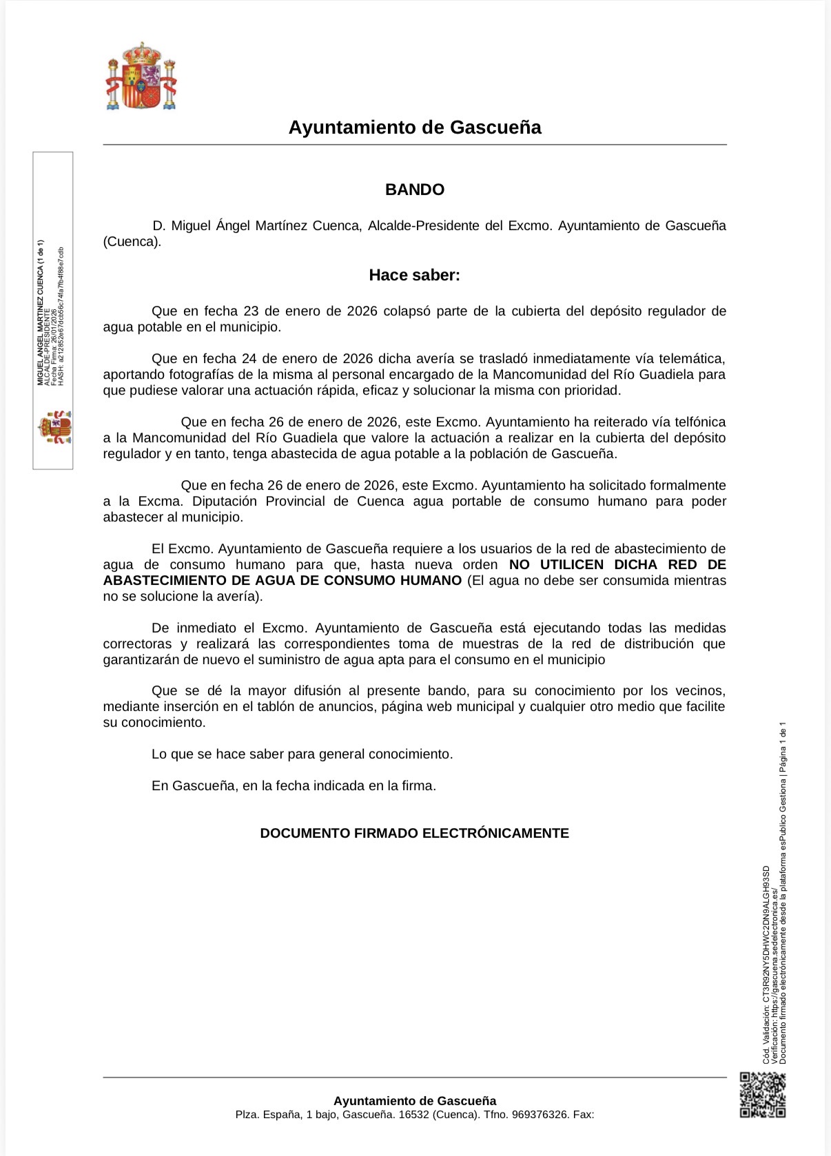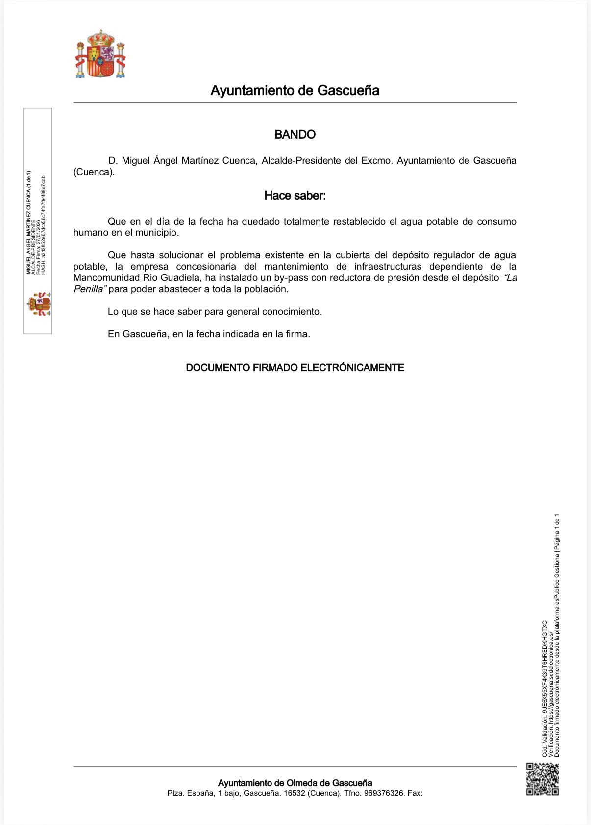 Por avería de una de las bombas de llenado del depósito de Gascueña habido bajada de presión, se está trabajando para solucionar la incidencia lo antes posible, por parte del ayuntamiento nos hemos puesto en contacto con la Diputación de Cuenca y nos abastecerán con cisternas mientras se soluciona la incidencia.