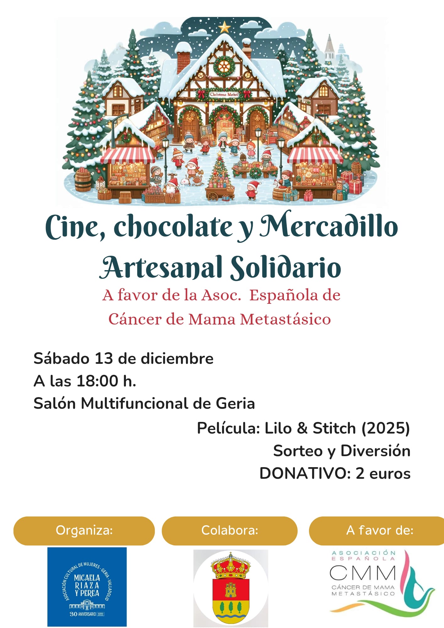 La Asociación Cultural de Mujeres Micaela Riaza y Perea quiere agradecer por este medio a todos los que de una manera u otra habéis participado en la jornada de cine, chocolate y mercadillo solidarios que se celebró el sábado 13 de diciembre a favor de la Asociación de Cáncer de Mama Metastásico y del cual se recaudó un total de 1.616,50 €.