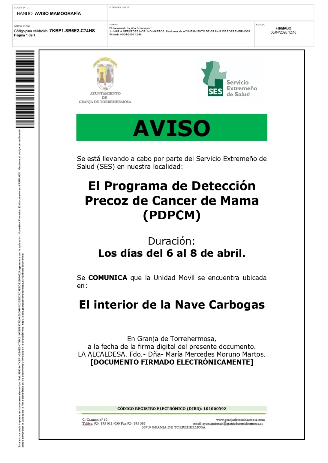 Adjuntamos información correspondiente a la visita de la unidad móvil para realización de mamografías en nuestra localidad.