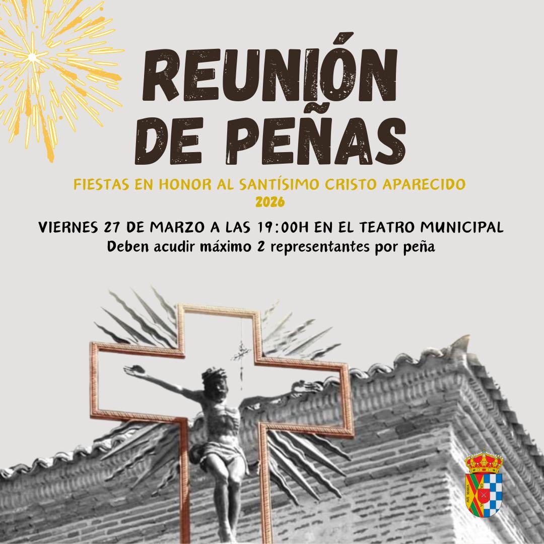 📢El próximo viernes 27 de marzo a las 19:00h en el Teatro Municipal tendrá lugar la primera reunión de peñas para nuestras fiestas patronales en Honor al Santísimo Cristo Aparecido.
