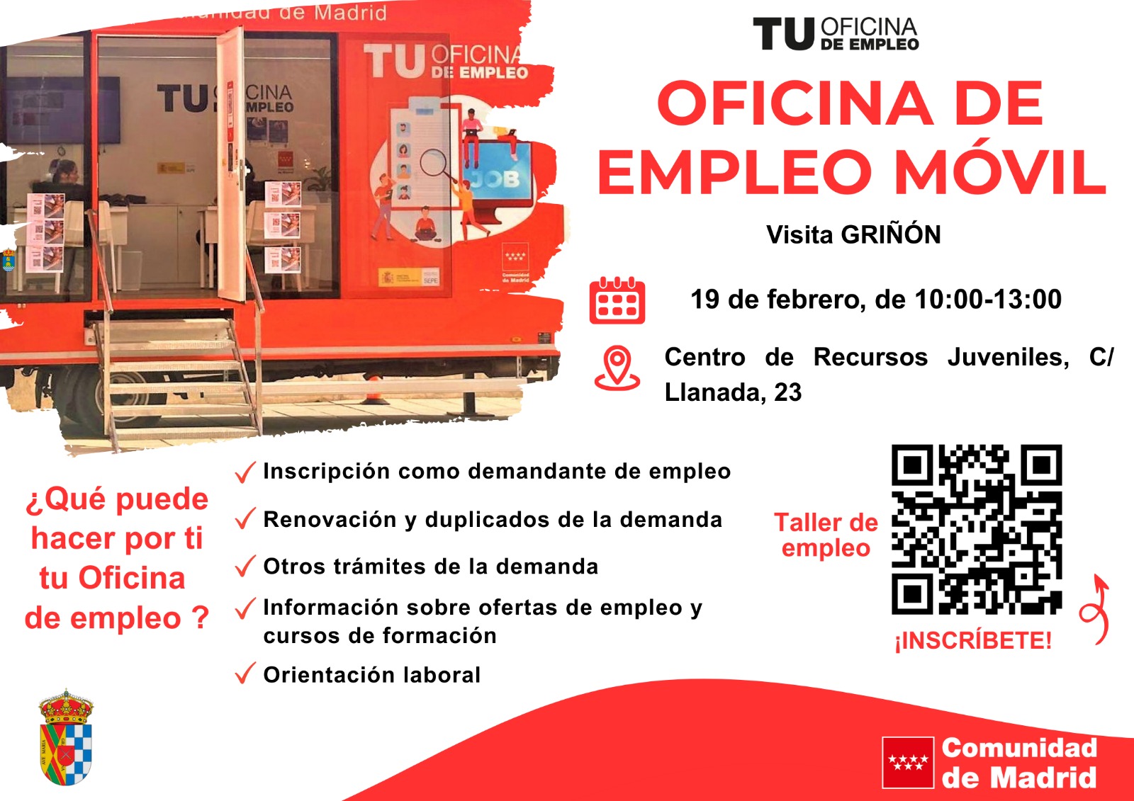 Nos complace informarte que la oficina de empleo móvil estará en Griñón el próximo día 19 de febrero del 2026, en el parking del centro de recursos juveniles en la C/ Llanada 23.