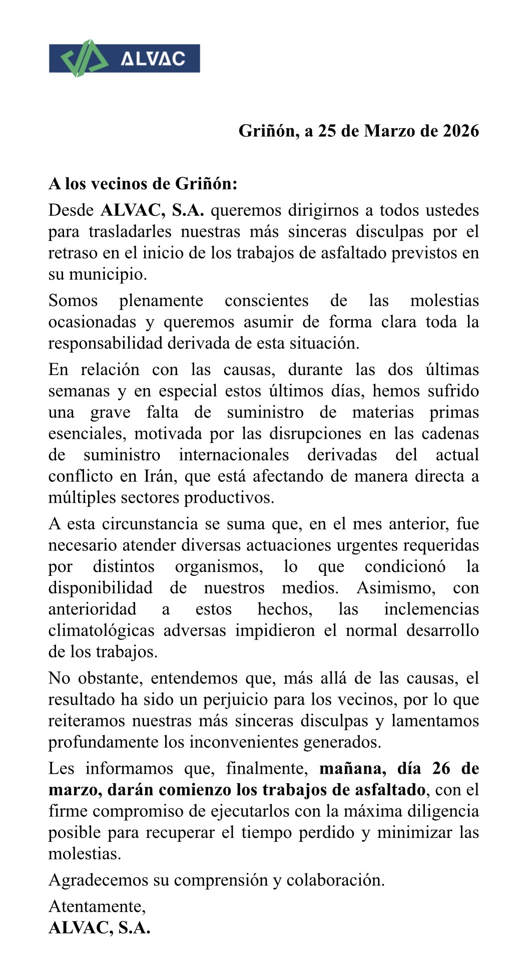 COMUNICADO DE LA EMPRESA ADJUDICATARIA DEL PLAN ASFALTO