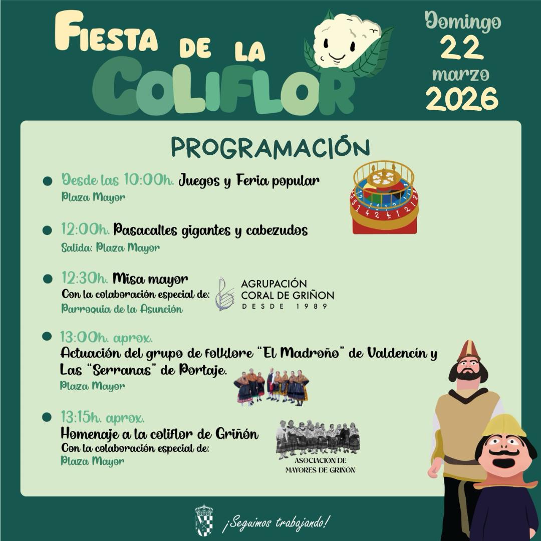 El próximo domingo 22 de marzo tendremos nuestra tradicional fiesta de la coliflor en la Plaza Mayor. Con juegos, pasacalles, misa, actuaciones y homenaje a la coliflor.
