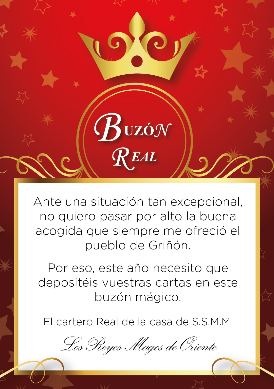 ¡ Niños de Griñón !2020-12-14 20:38:33INFORMACIÓN GENERALCorred y decidle a vuestros papás y mamás que la oficina de correos de S.S. M.M los Reyes Magos de Oriente ha instalado un buzón mágico en nuestro pueblo.