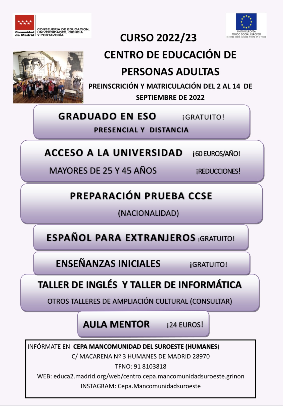 Esta semana se abre la preinscripción del 2 al 14 de Septiembre y matriculación en Griñon el 8 de Septiembre en el Centro Cultural para el curso 2022/2023.