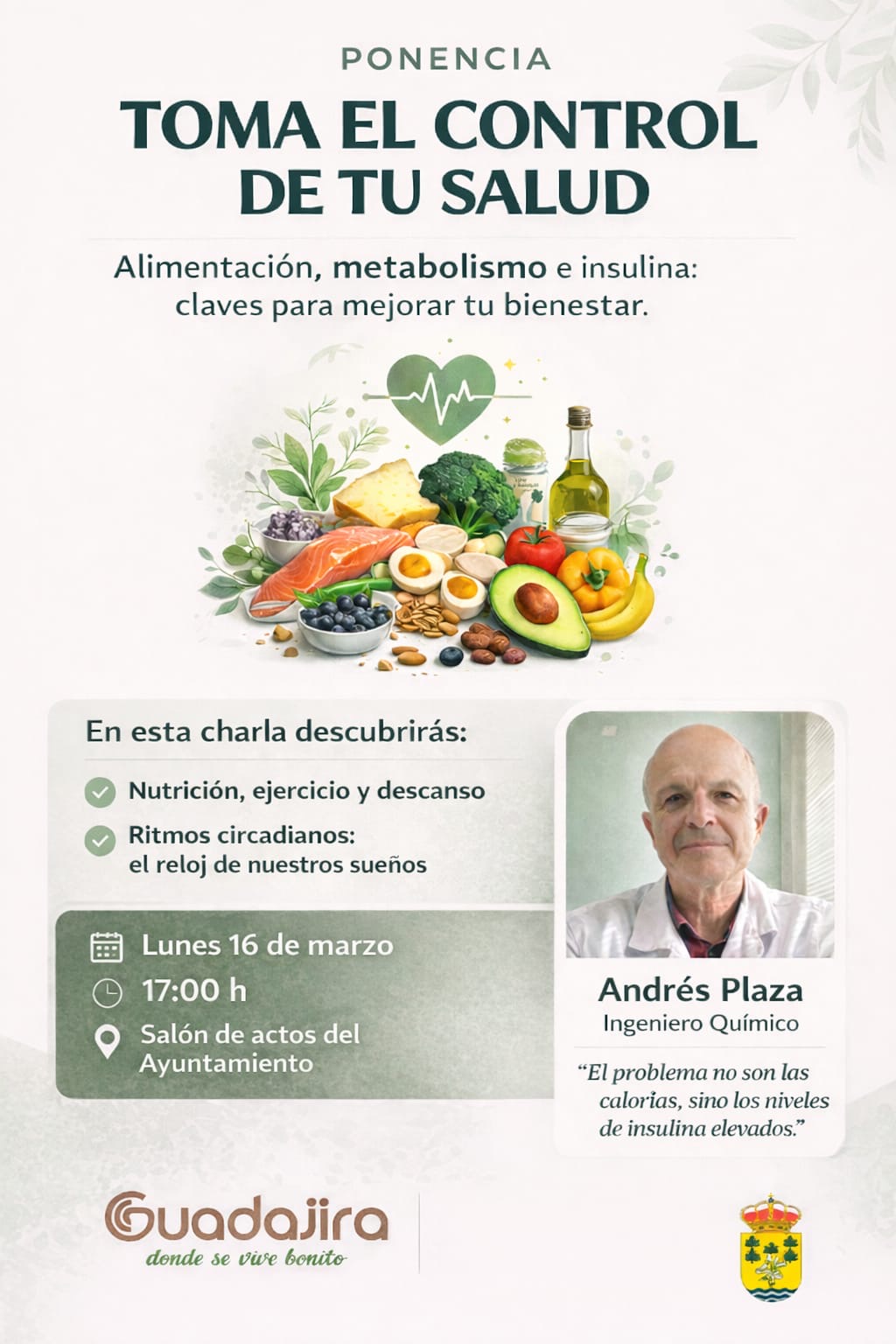 si quieres mejorar tu estado físico, salud y hábitos alimenticios para sentirte mejor y poder estar en forma física, te animamos a participar el próximo lunes a las 17h en el salón de actos del ayuntamiento a asistir al taller ponencia “Toma el control de tu salud”.