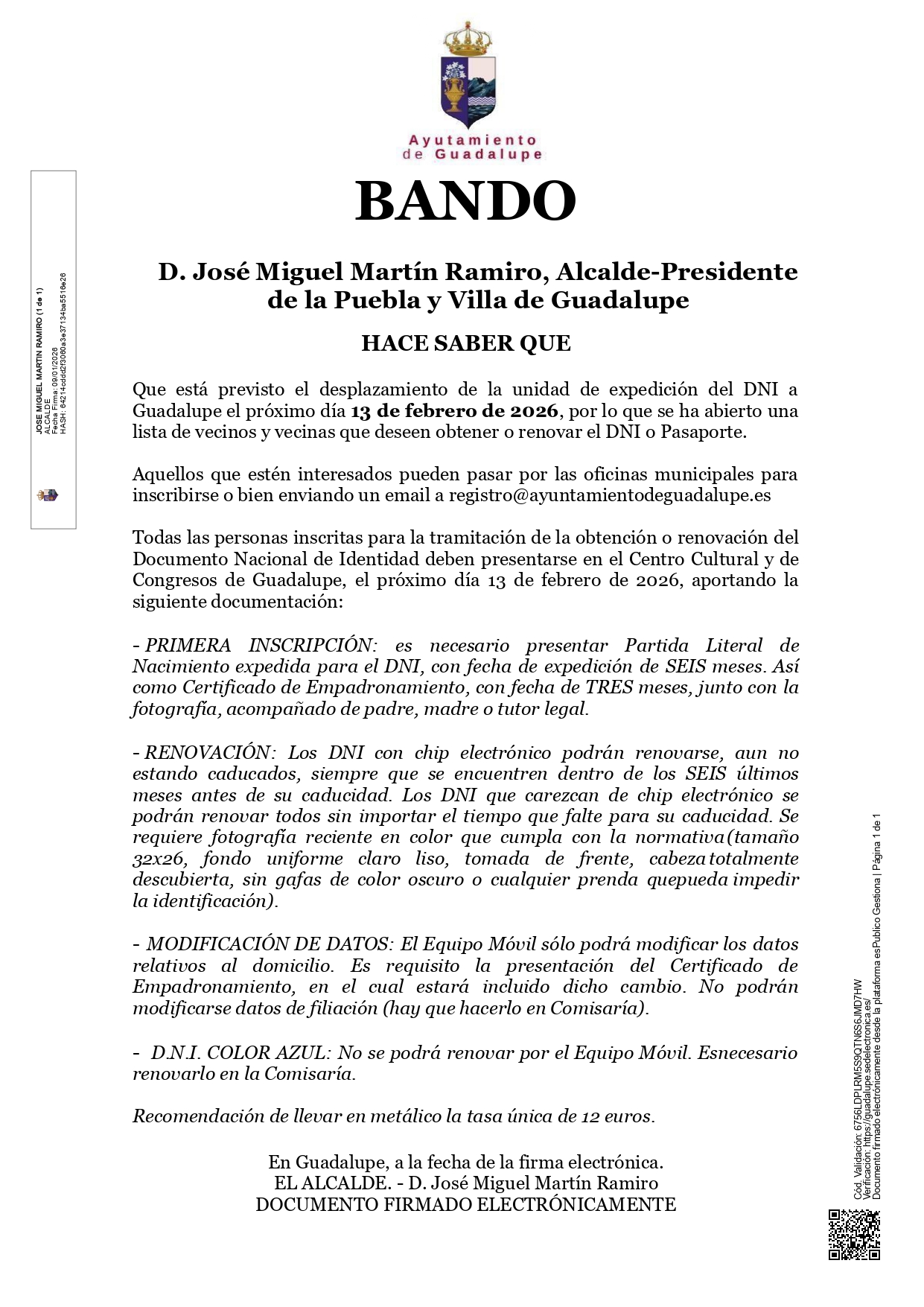 Que está previsto el desplazamiento de la unidad de expedición del DNI a Guadalupe el día 13 de febrero de 2026 por lo que se abrirá una lista de vecinos y vecinas que deseen obtener o renovar el DNI.