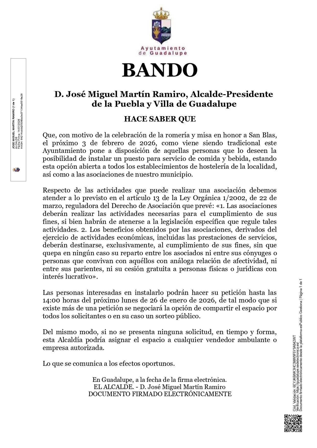 D. José Miguel Martín Ramiro, Alcalde-Presidente de la Puebla y Villa de Guadalupe, hace saber:
