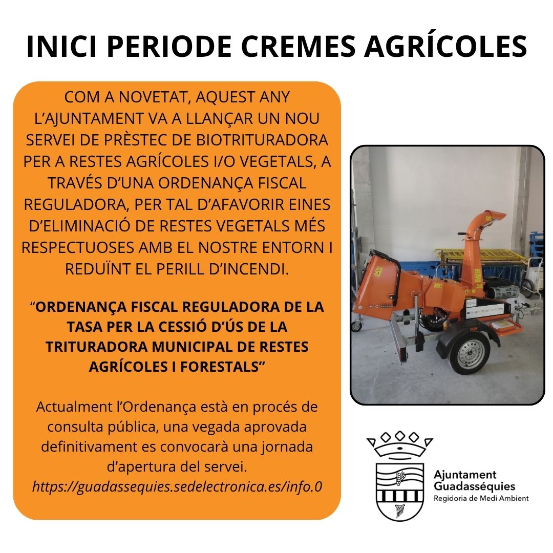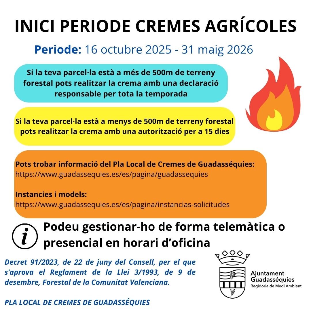 🏛️ Des de l’Ajuntament de Guadasséquies informem que de hui, 16 d’octubre de 2025 al 31 de maig de 2026 estarà obert el període autoritzat de cremes agrícoles, d’acord amb el Decret 91/2023, de 22 de juny, del Consell.