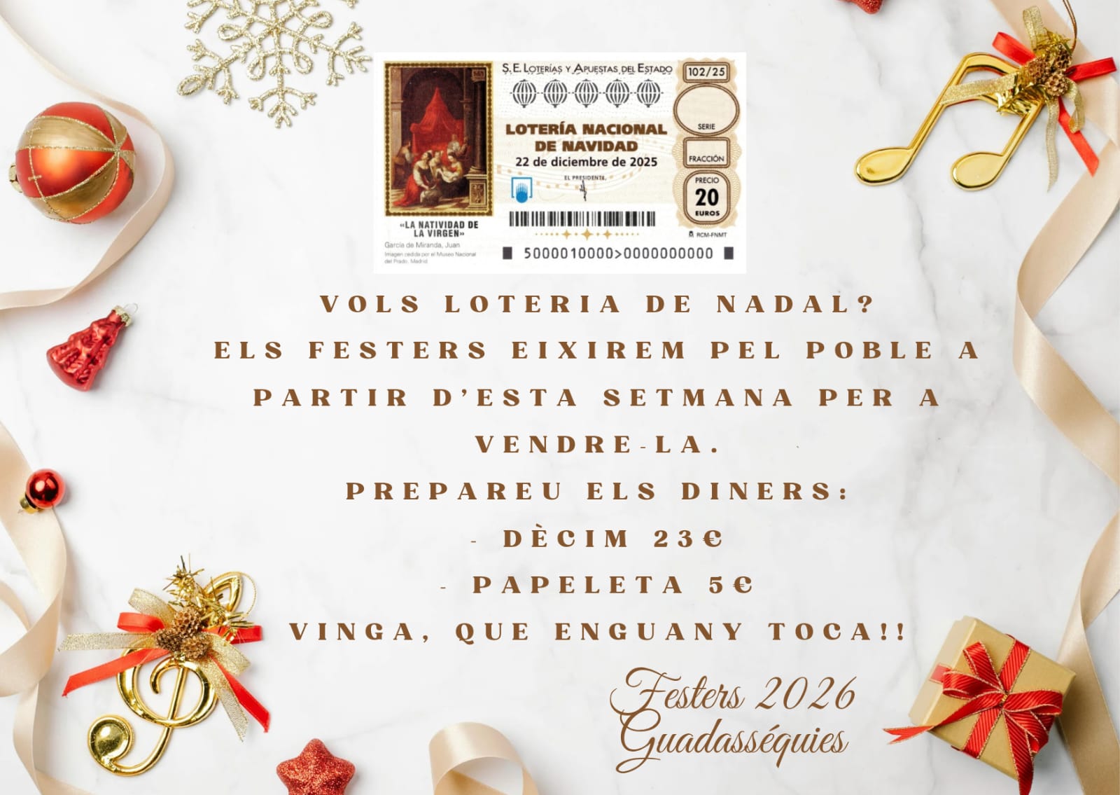 S'Informa que els festers del 2026 passaran per tot el poble a vendre la loteria de NADAL i de REIS, per tant, els abonats no caldrà que passen per l'ajuntament a recollir-la.