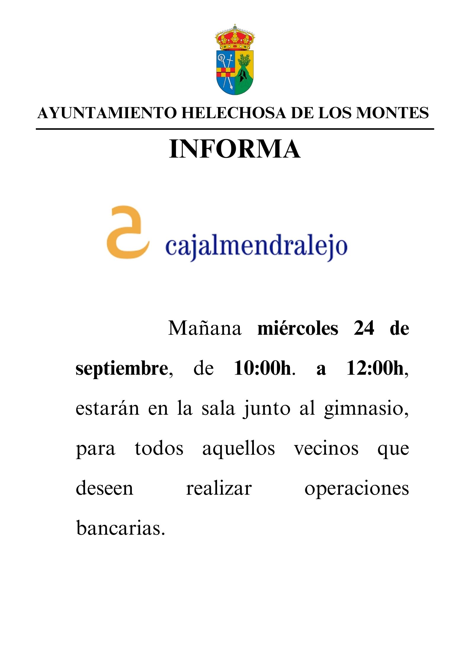SE INFORMA A TODOS LOS VECINOS QUE LOS OPERARIOS DE CAJA ALMENDRALEJO ESTARÁN MAÑANA MIERCOLES A PARTIR DE LAS 18:00. PARA ATENDER A TODOS LOS VECINOS QUE LO NECESITEN. ESTARÁN EN EL SALÓN JUNTO AL GIMNASIO. -