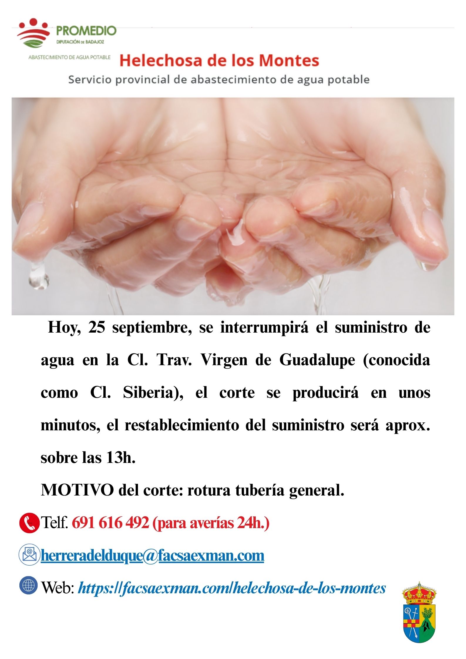 POR MOTIVO DE AVERIAS EN LA CALLE SIBERIA SE CORTARA EL SUMINISTRO DE AGUA HASTA LAS 14:00 HORAS -