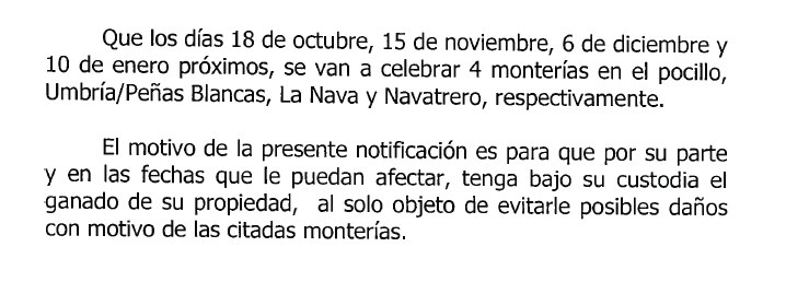 Según comunicación emitida pore la Sociedad de Cazadores "Los Monteros", publicada en el tablón de anuncios del Ayuntamiento de Helechosa, se informa a ganaderos y vecinos, que los días 18 de octubre, 15 de noviembre, 6 de diciembre y 10 de enero, se celebrarán cuatro monterías en el Pocillo, Umbría/Peñas Blancas, la Nava y Navatrero, respectivamente.