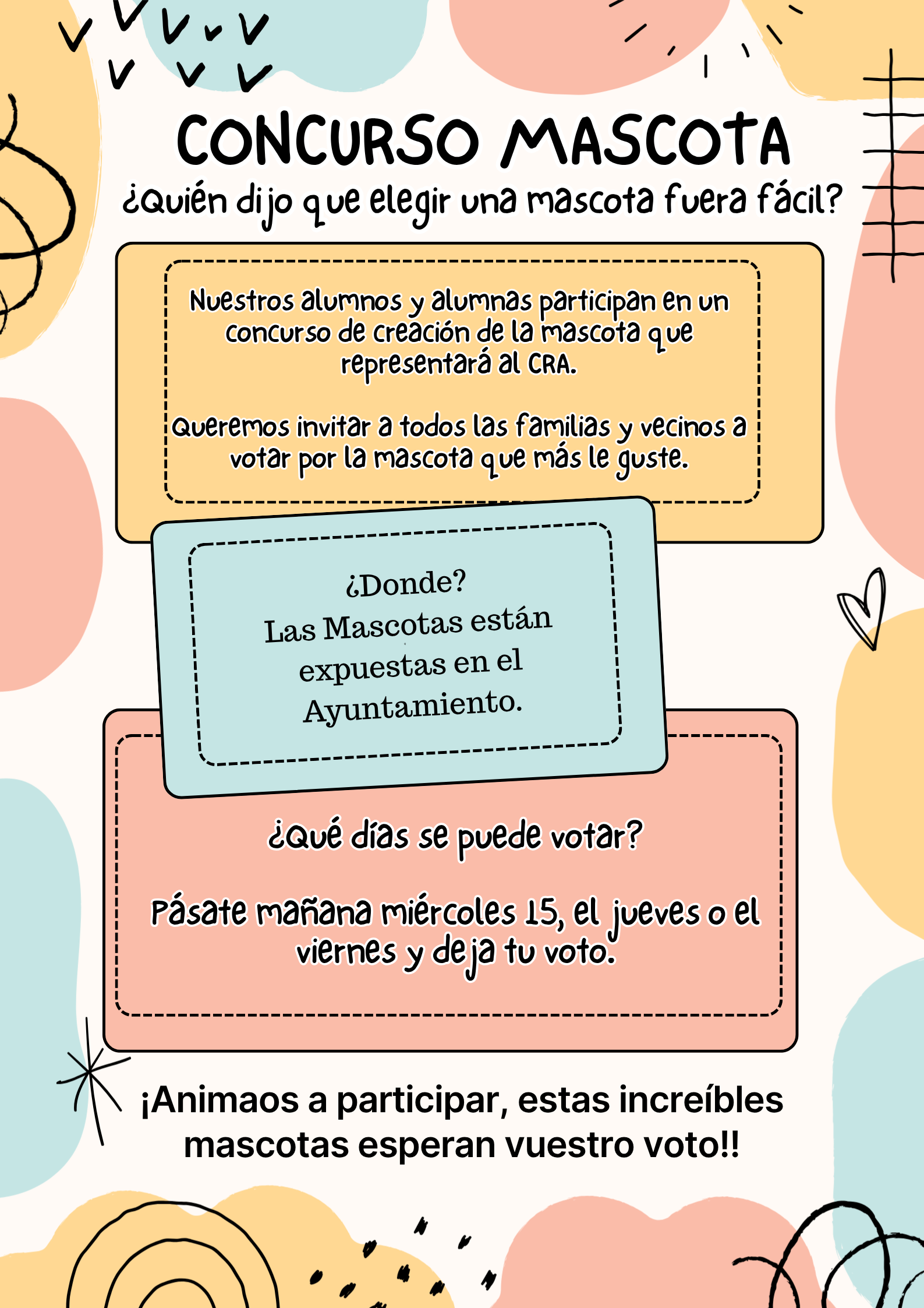Desde el CRA Campo Arañuelo, los alumnos y alumnas han participado en un concurso de creación de mascotas que representará en adelante al cole y queremos invitar a todos los vecinos y vecinas a pasarse por el Ayuntamiento para disfrutar de la exposición y, lo más importante... ¡ayudarnos a elegir a la ganadora!