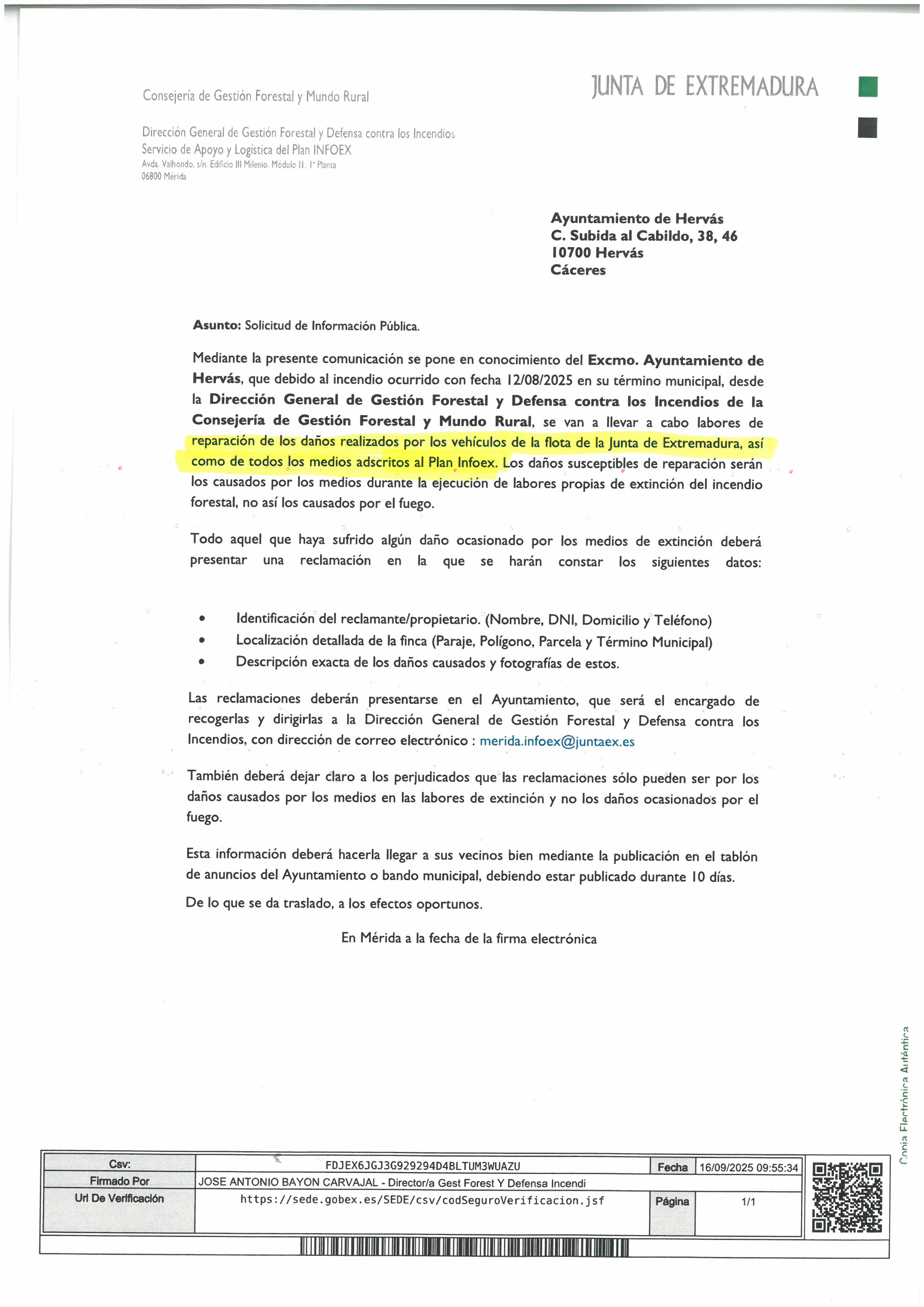 Desde el Ayuntamiento de Hervás se pone en conocimiento de cualquier vecino afectado por el incendio forestal, a los efectos de conocer los daños ocasionados y sus necesidades, lo siguiente: