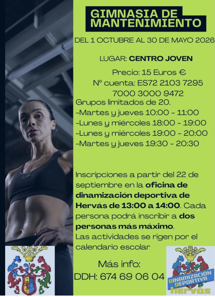 GIMNASIA DE MANTENIMIENTO Del 1 de Octubre de 2025 al 30 de Mayo de 2026. *Lugar Centro Joven *Precio 15 € *Cuenta: ES72 2103 7295 7000 3000 9472 *Grupos limitados de 20 personas. *Martes y jueves 10:00-11:00 *Lunes y Miércoles 18:00-19:00 *Lunes y Miércoles 19:00-20:00 *Martes y Jueves 19:30-20:30 *Inscripciones a partir del 22 Septiembre en la oficina de dinamización deportiva de Hervás de 13:00 a 14:00. *Cada persona podrá inscribir a dos personas más como máximo. Las actividades(...)