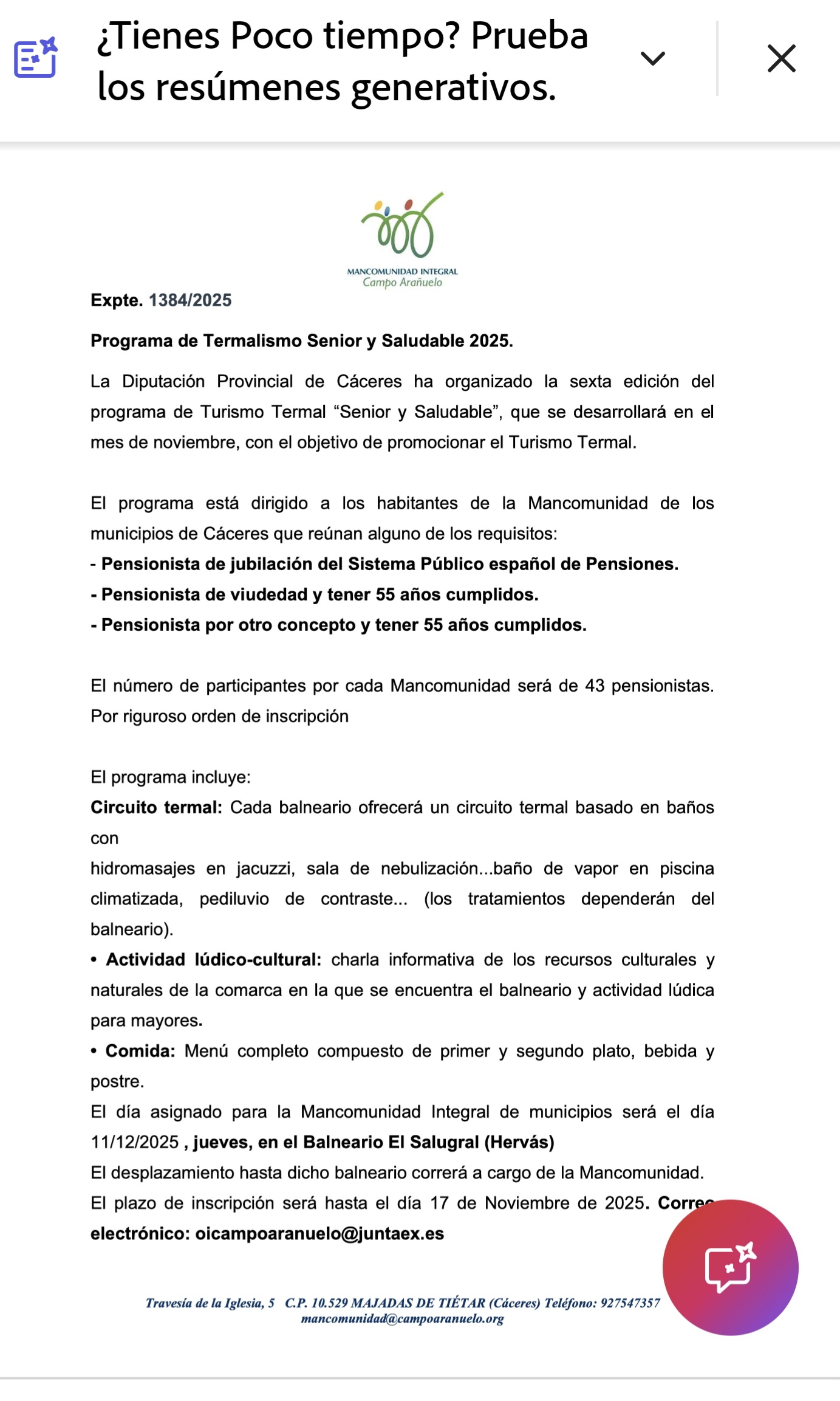 El INSERSO ha convocado el Programa de Termalismo, (publicado en el BOE, nº 264 el 3/11/2025) para jubilados donde se pueden solicitar plazas en balnearios (varios a elegir), con una duración de 10 días en pensión completa. El precio dependerá del balneario elegido. Si están interesados pueden preguntar en el Ayuntamiento para su inscripción cuyo plazo acaba en el 2 de diciembre de 2025.