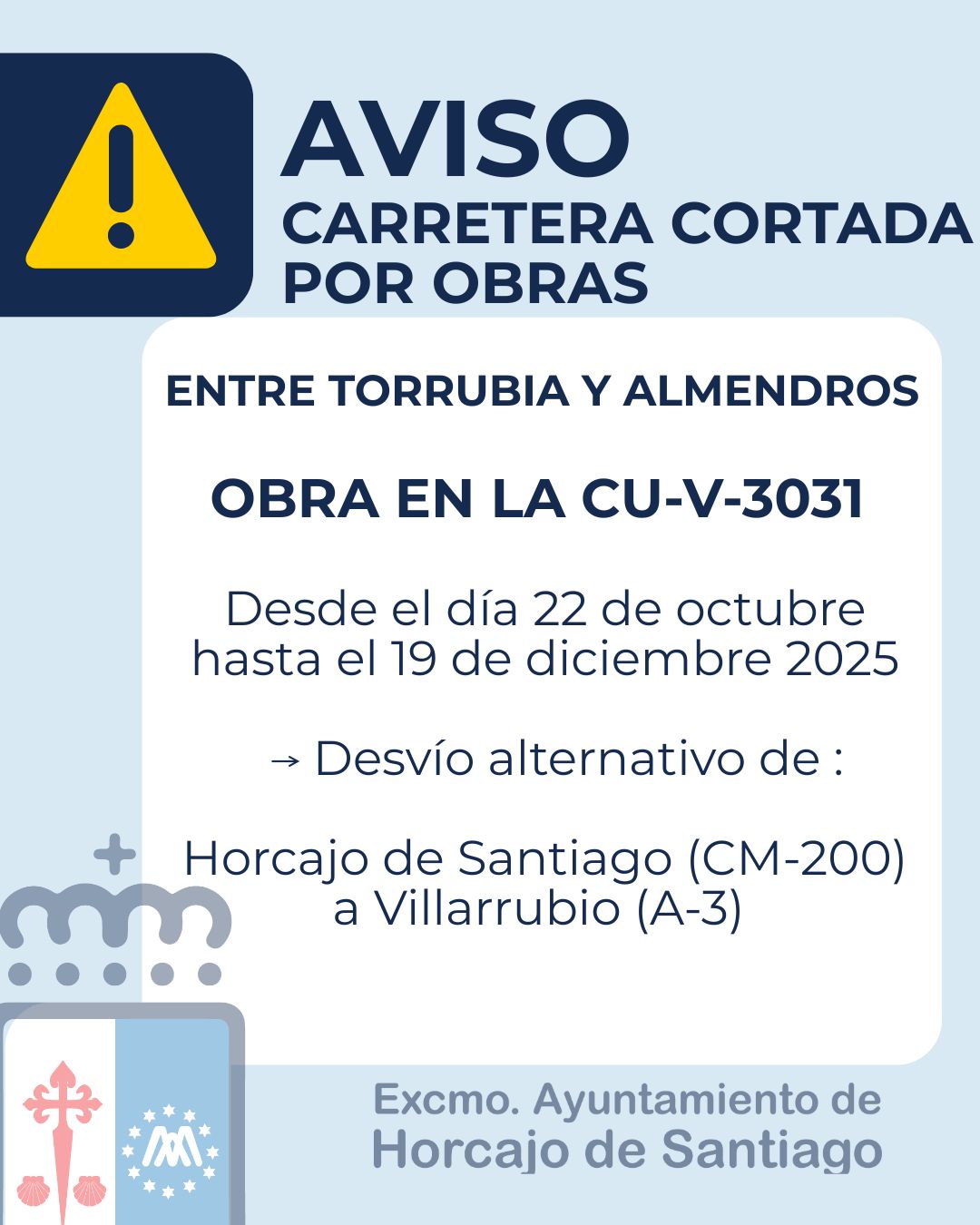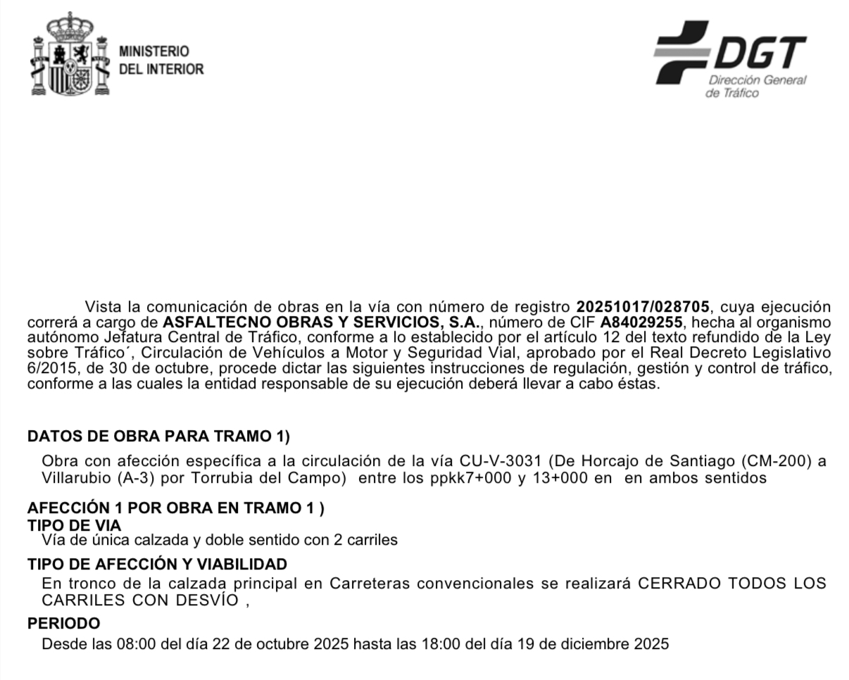 Informamos de que debido a obras de mejora del firme ejecutadas en la carretera CU-V-3031 (de Horcajo de Santiago a Villarrubio - A3, por Torrubia del Campo) la vía permanecerá cerrada al tráfico en ambos sentidos entre los puntos kilométricos 7 000 y 13 000.