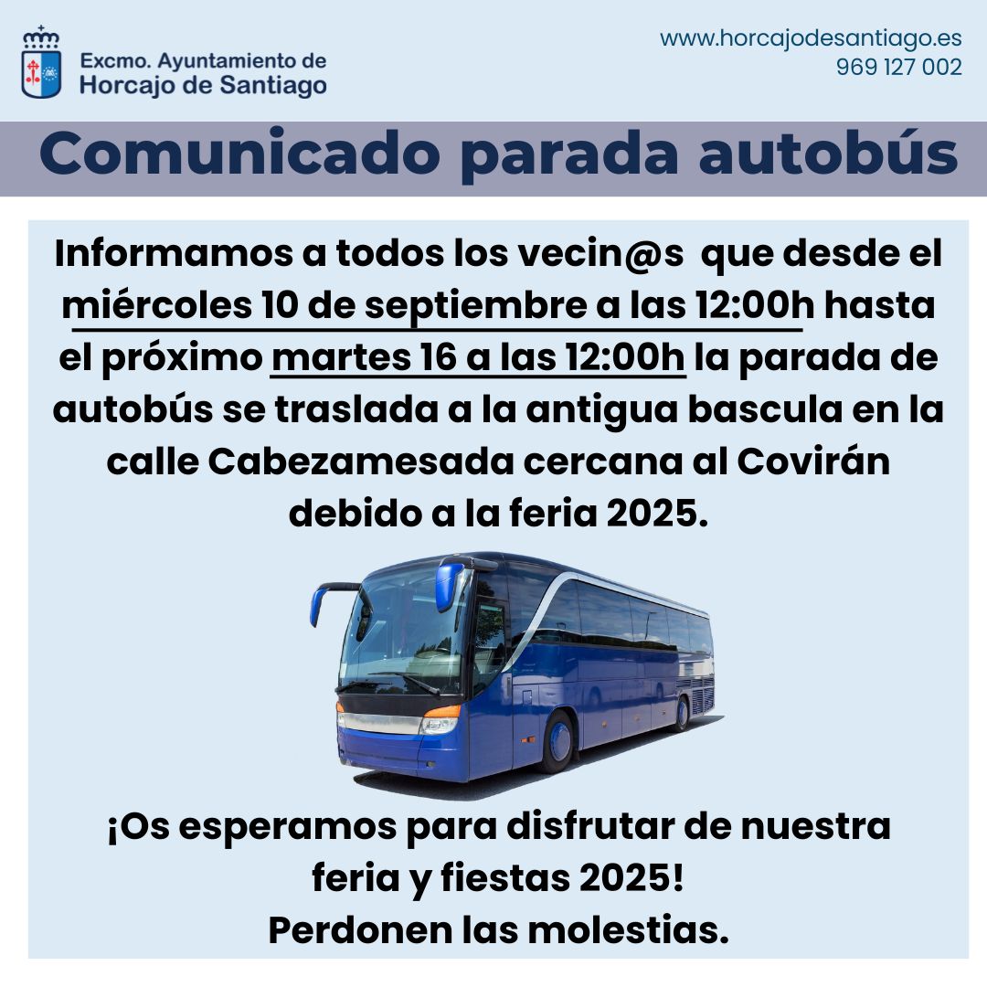 Se informa a que desde el miércoles 10 de septiembre a las 12:00h hasta el próximo martes 16 a las 12:00h la parada de autobús habitual de Alonso de Céspedes, se traslada a la parada provisional de costumbre en la antigua bascula en la calle Cabezamesada cercana, debido a la feria 2025 y por el corte de calle por la disposición del ferial.