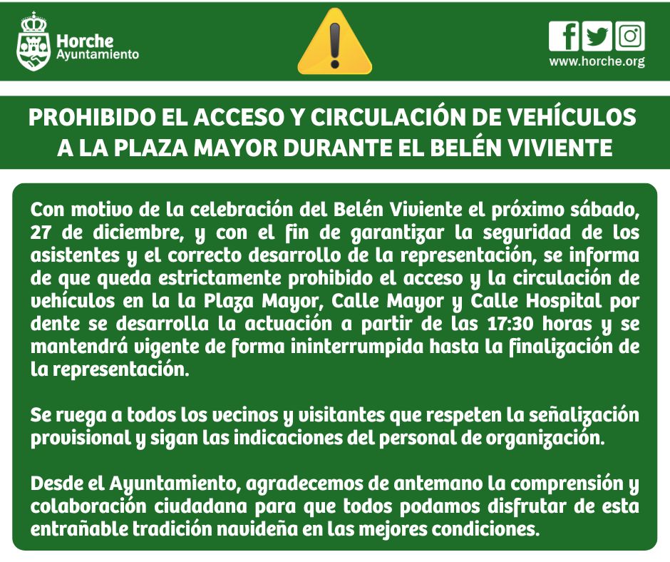 Con motivo de la celebración del Belén Viviente el próximo sábado, 27 de diciembre, y con el fin de garantizar la seguridad de los asistentes y el correcto desarrollo de la representación, se informa de que queda estrictamente prohibido el acceso y la circulación de vehículos a la Plaza Mayor, Calle Mayor y Calle Hospital por donte se desarrolla la actuación, a partir de las 17:30 horas y se mantendrá vigente de forma ininterrumpida hasta la finalización de la representaci(...)