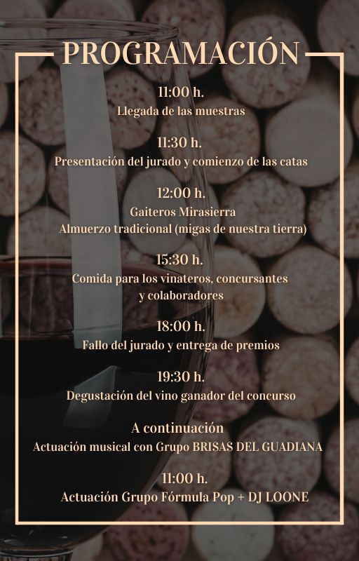 XLV CONCURSO DEL VINO DE HORCHE2026-04-08 20:00:00CulturaHorche se viste de gala para celebrar la XLV edici贸n del Concurso del Vino "Villa de Horche". Organizado por el grupo de bodegueros del municipio con el apoyo del Ayuntamiento y la Diputaci贸n de Guadalajara, nos espera una jornada inolvidable llena de sabor, m煤sica y alegr铆a.