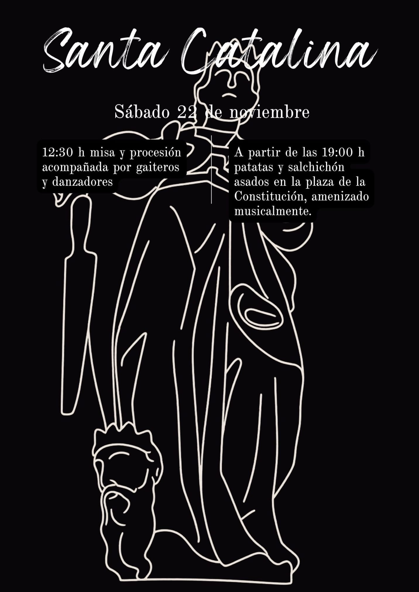 Sábado 22 de noviembre:- A las 12:30 Horas: Misa en la Iglesia Parroquial. A continuación, Procesión, acompañando a Santa Catalina con los grupos de gaiteros y danzadores.