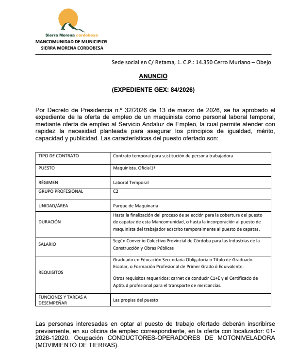 La Mancomunidad de Municipios Sierra Morena Cordobesa ha aprobado una oferta de empleo para cubrir un puesto de 👇