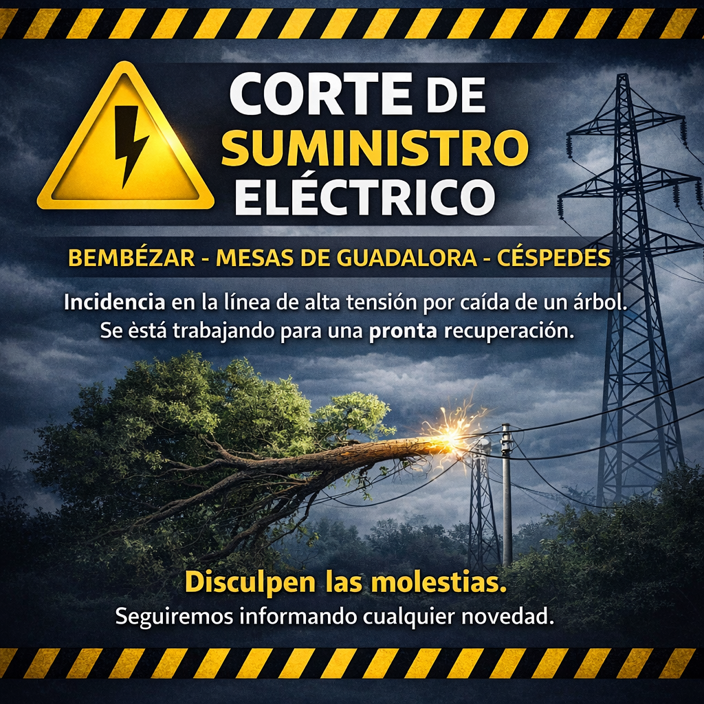 El Ayuntamiento de Hornachuelos informa de un corte de suministro eléctrico que está afectando a las pedanías de Bembézar, Mesas de Guadalora y Céspedes, debido a una incidencia en la línea de alta tensión provocada por la caída de un árbol.