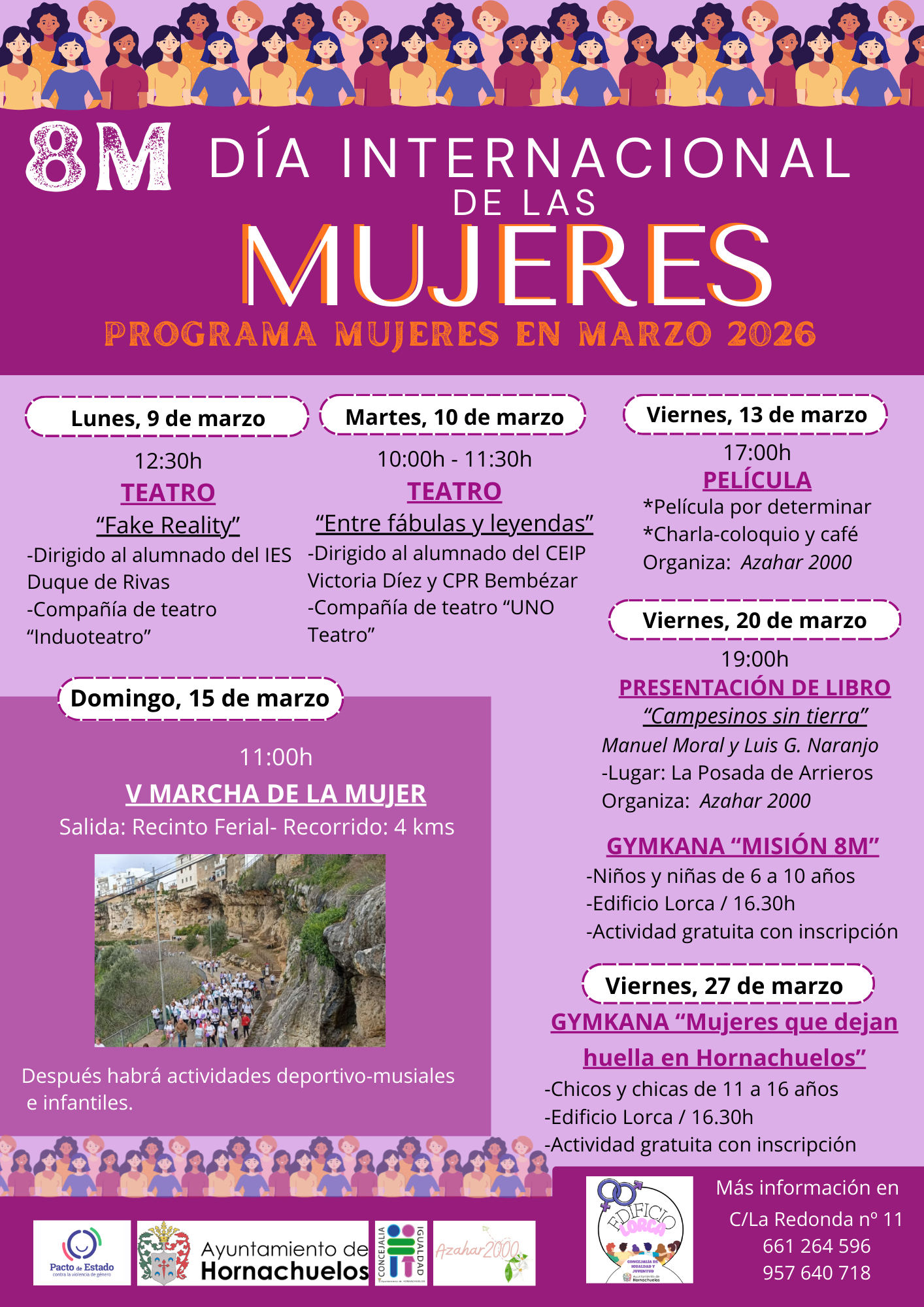 El Ayuntamiento de Hornachuelos presenta el programa de actividades con motivo del Día Internacional de las Mujeres (8M), que se desarrollará a lo largo del mes de marzo con propuestas culturales, educativas y de convivencia dirigidas a toda la ciudadanía.