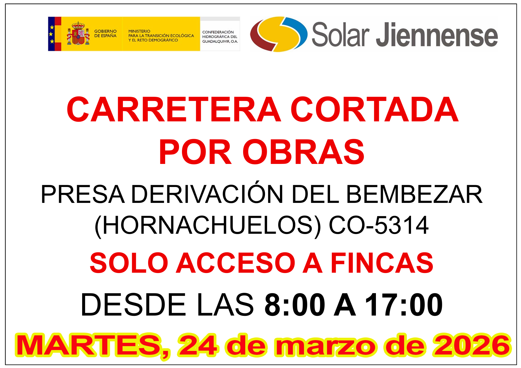 Se informa a la ciudadanía de que la carretera CO-5314, a la altura de la presa de derivación del Bembézar (Hornachuelos), permanecerá cortada al tráfico debido a trabajos en la zona.