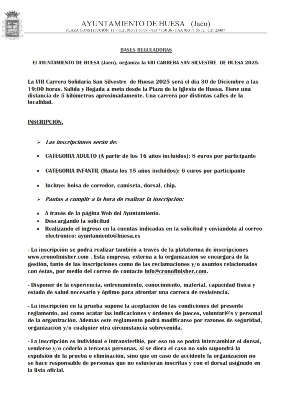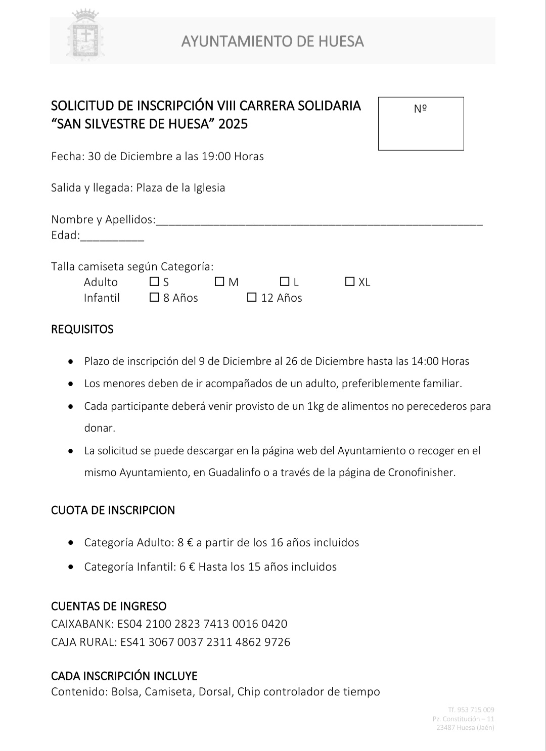 📌 Desde hoy se pueden hacer las inscripciones a través de la plataforma www.cronofinisher.com e incluso descargando la solicitud de inscripción que se adjunta, y una vez cumplimentada y realizado el ingreso de la misma, enviarla al correo electrónico ayuntamiento@huesa.es.