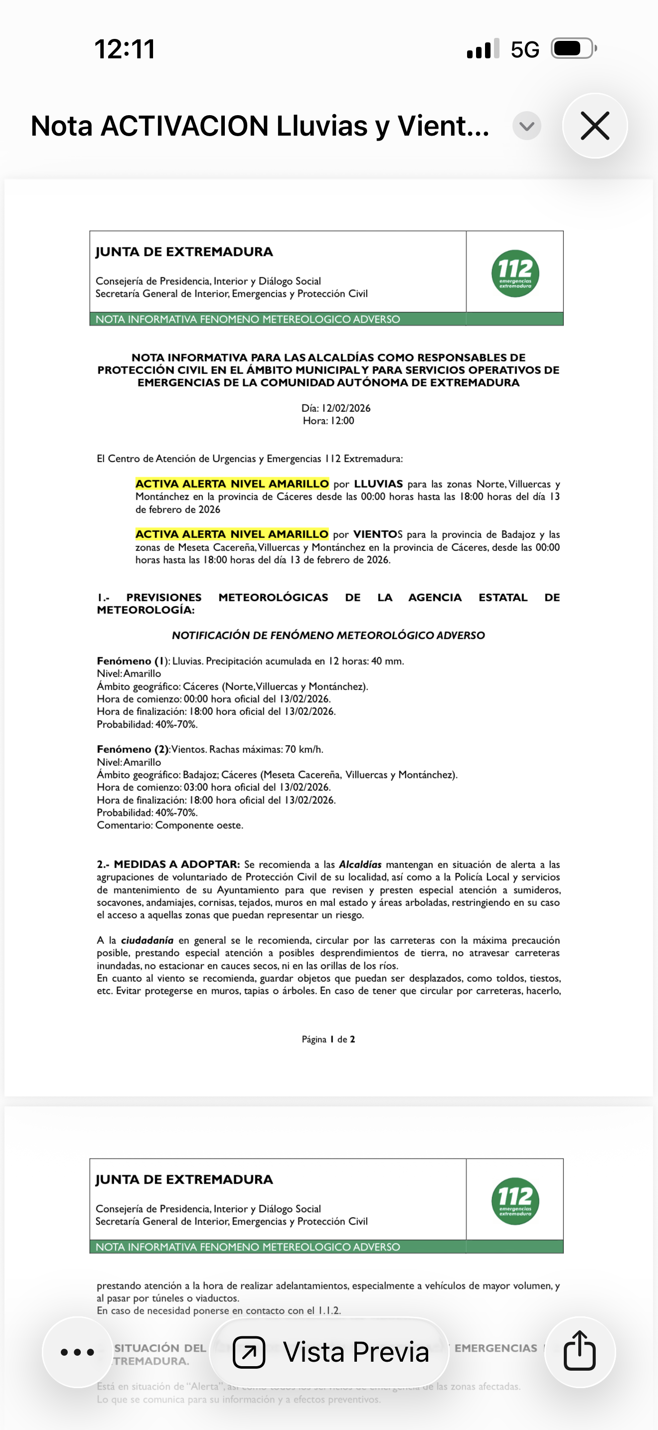 Delegación Gobierno Extremadura_Unidad Protección Civil. Sres./Sras. Alcaldes y Alcaldesas. Buenos días. Ante las condiciones meteorológicas que se están produciendo en Extremadura, rogamos que transmitan a sus ciudadanos/as que si no es absolutamente imprescindible eviten los desplazamientos. -