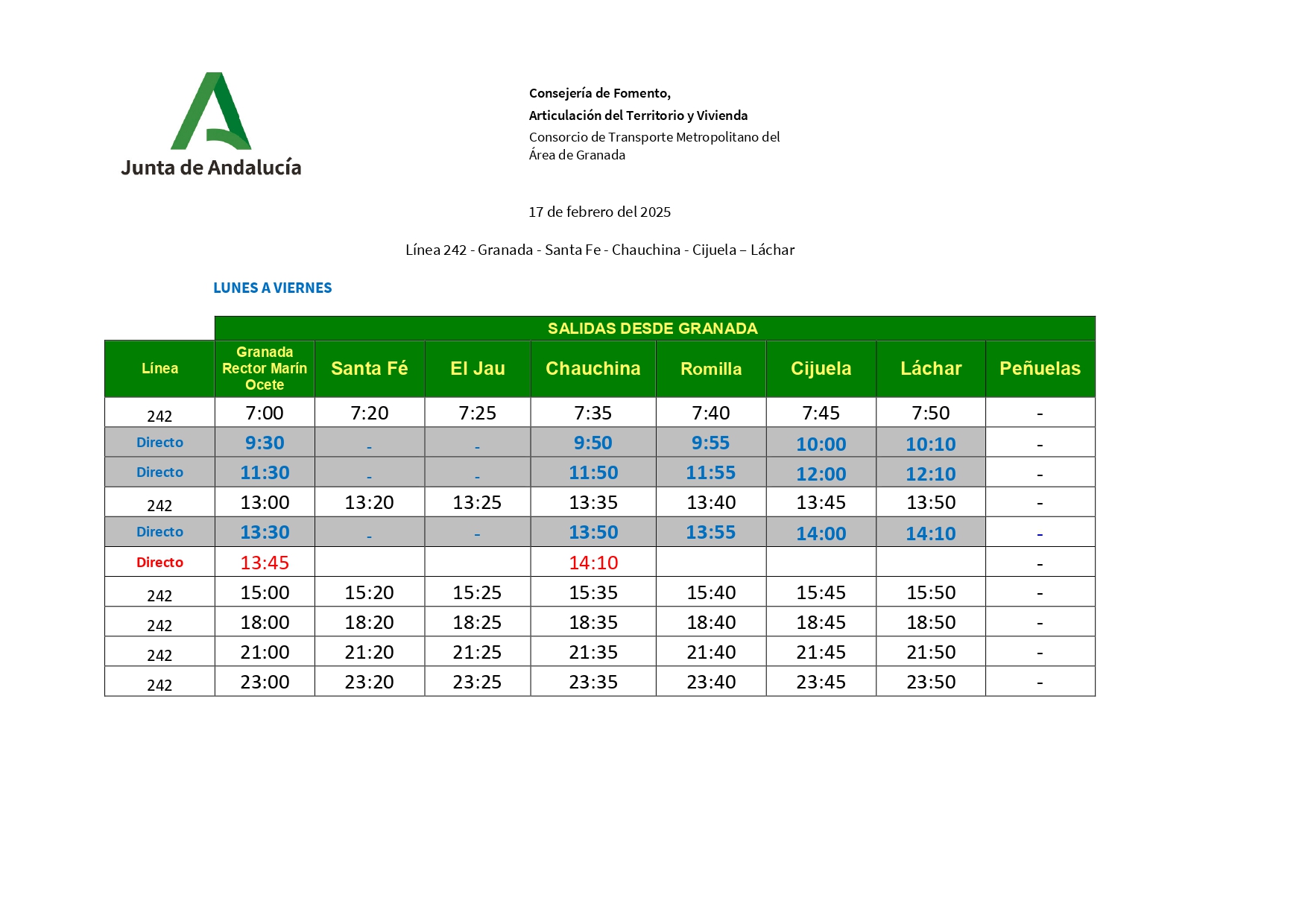🚍 NUEVOS HORARIOS DE BUS2025-02-18 11:04:39Info GeneralEl Ayuntamiento de Láchar, en colaboración con el Ayuntamiento de Cijuela y con el Consorcio de Transporte Metropolitano del área de Granada, ponemos en marcha una línea directa de autobús que conectará nuestros municipios con Granada.
