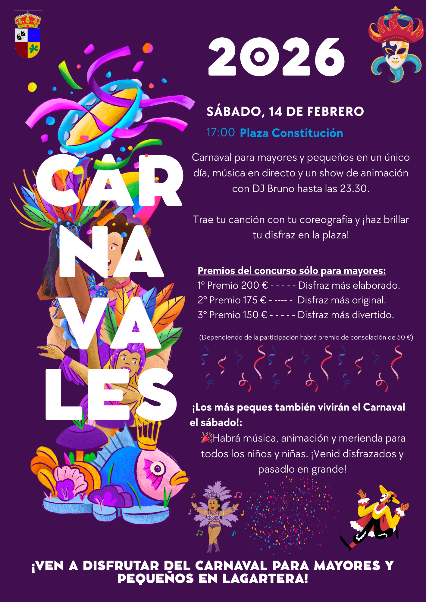 El sábado 14 de febrero de 2026, te esperamos en la Plaza de la Constitución para celebrar juntos el CARNAVAL 2026.