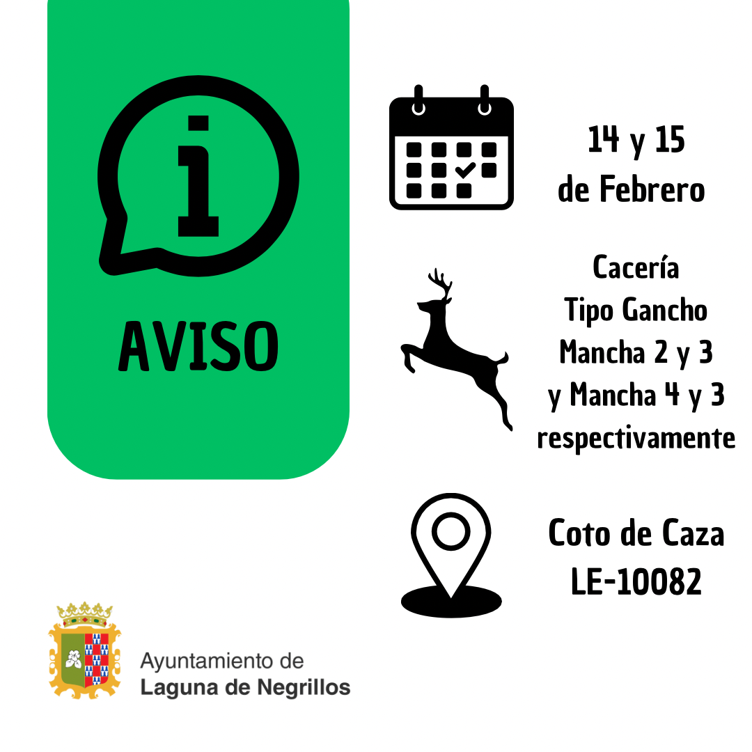 El Servicio Territorial de Medio Ambiente de León nos informa de la siguiente cacería colectiva de tipo Gancho que tendrá lugar en el coto de caza LE-10082 el sábado 14 de febrero de 2026 en la mancha 2 y 3 y el domingo 15 de febrero de 2026 en la mancha 4 y 3.