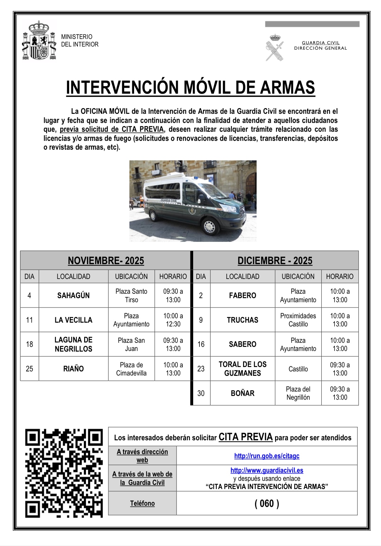 La OFICINA MÓVIL de la Intervención de Armas de la Guardia Civil se encontrara en Laguna de Negrillos el 18 de noviembre de 2025 de 09:30 a 13:00h. en la Plaza de San Juan Bautista con la finalidad de atender a aquellos ciudadanos que, previa solicitud de CITA PREVIA, deseen realizar cualquier trámite relacionado con las licencias y/o armas de fuego (solicitudes o renovaciones de licencias, transferencias, depósitos o revistas de armas, etc).